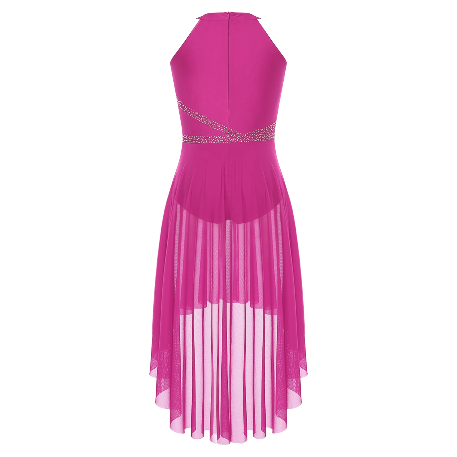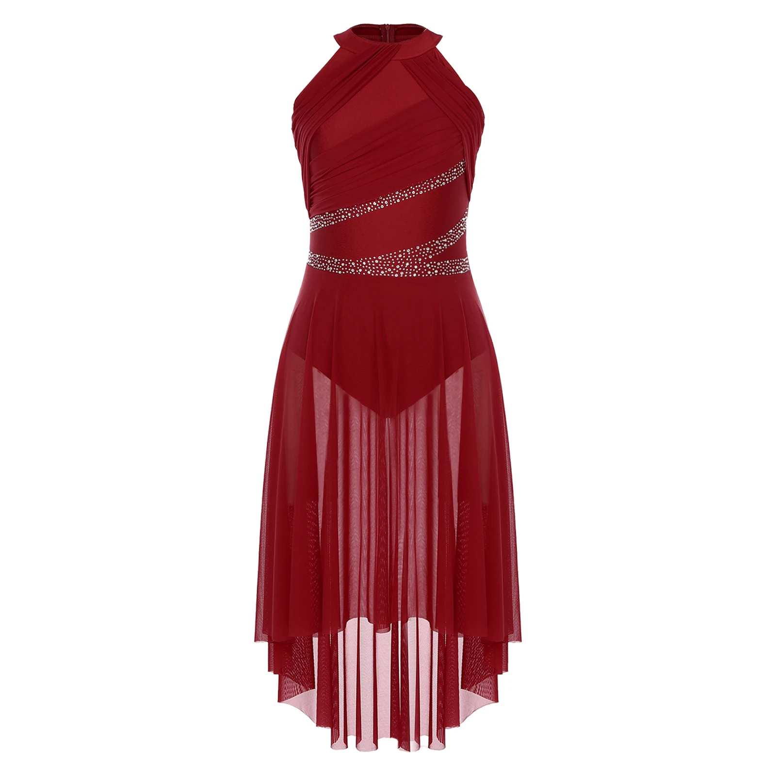 Womens Modern Lyrical Dance Dress High-Low Tulle Rhinestone Ballet Gymnastics Leotards Figure Skating Performance Costume 2028
