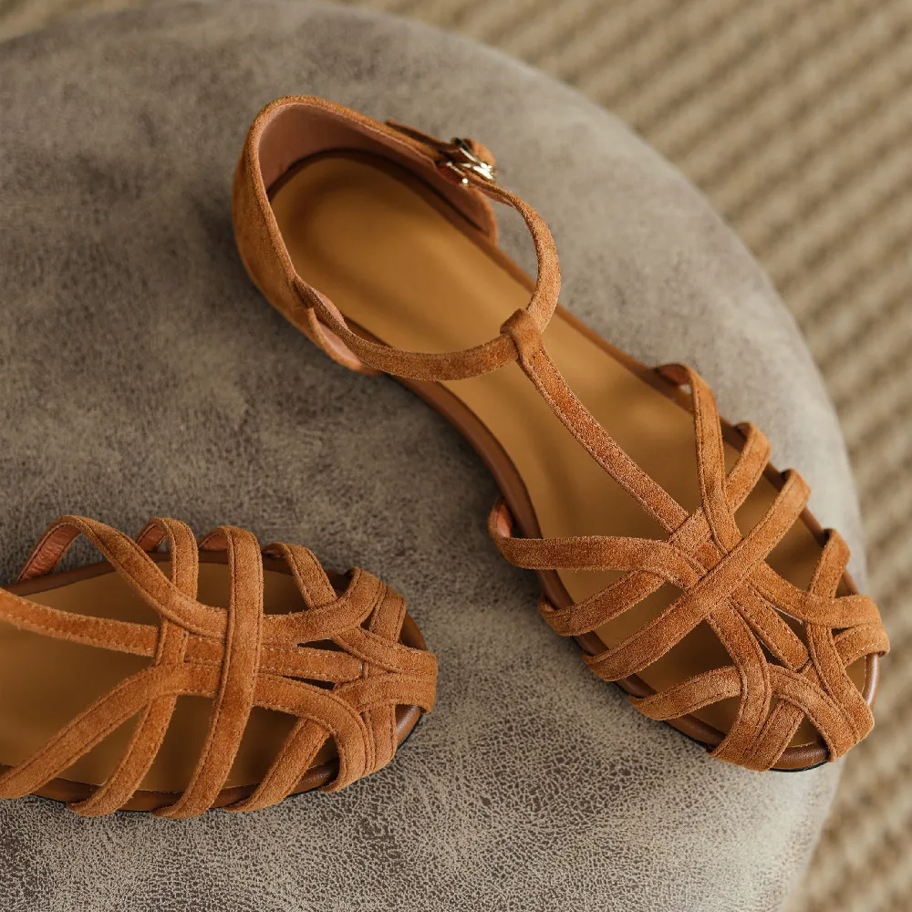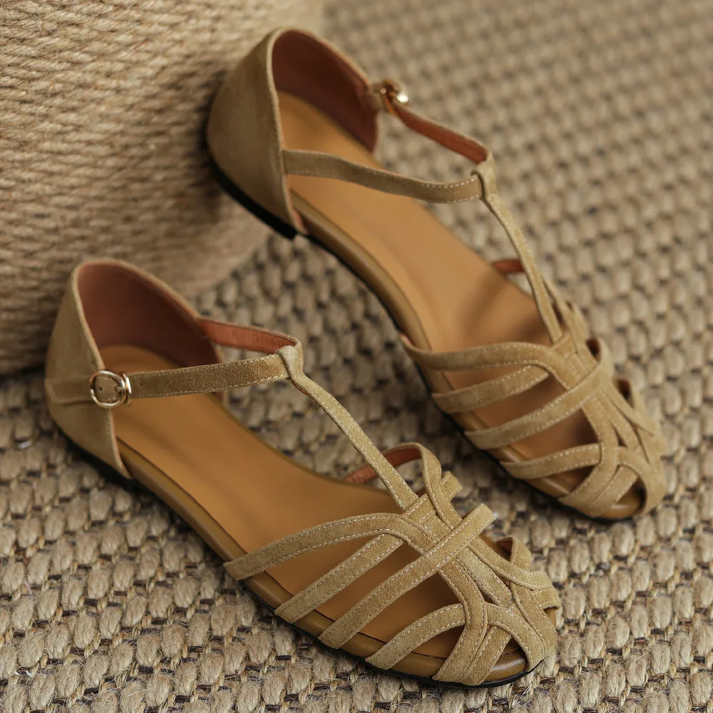 Women’s natural suede leather narrow band braided t-strap flats sandals round toe casual female footwear summer shoes for women