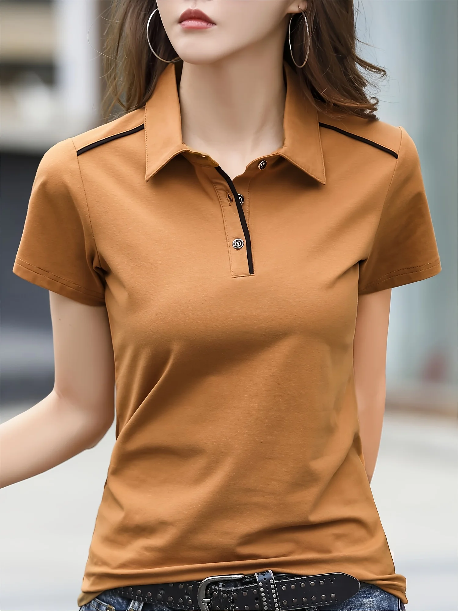 Women’s neckline contrast design solid color short sleeve POLO shirt fashion casual knit top can be machine washed and dry clean