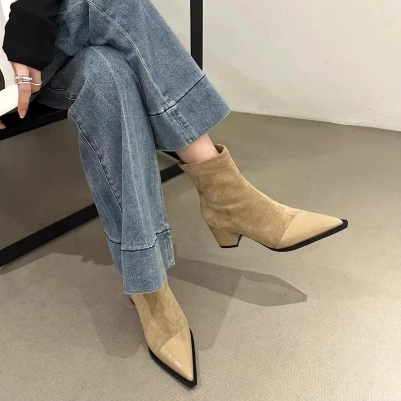 Women’s New Autumn Chunky Single Boots Pointed Suede Splicing Anti-slip Wear-resistant Ankle Boots
