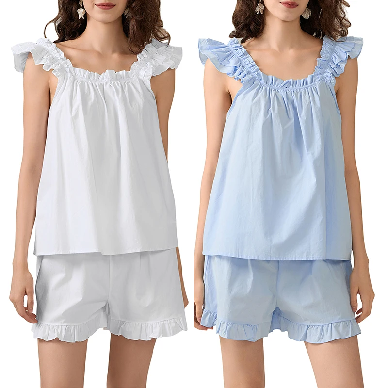 Womens Pajama Sets Women’s Summer 2PCS Pajamas Sets Sleeveless Backless Sling Vest + Solid Color Ruffle Shorts