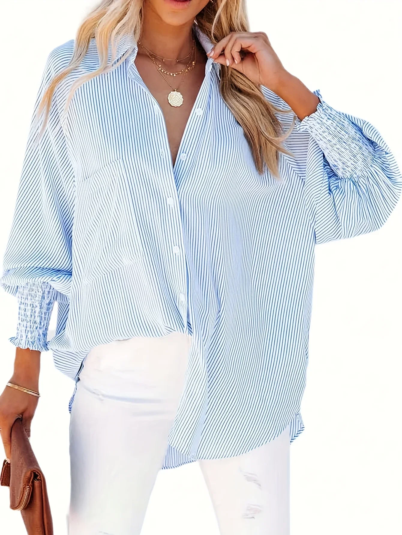 Women’s Plus Size 1XL-5XL Casual Striped Breathable Long Sleeve Blouse Shirt Ladies Fashion V-neck Button-down Loose Shirt Top