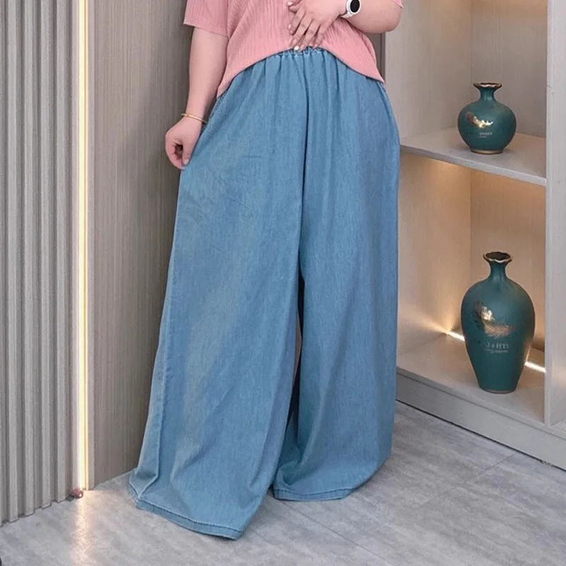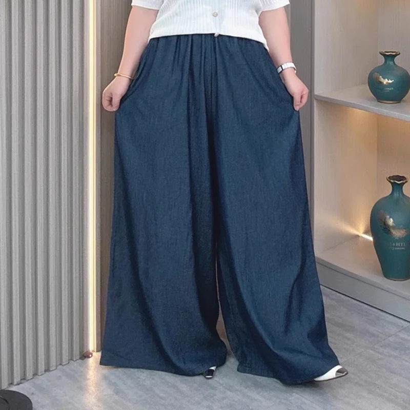 Women’s Plus Size Lightweight Lyocell Jeans Culottes High Waisted Wide Leg Pants With Draped Ice Silk Fabric For Spring Summer