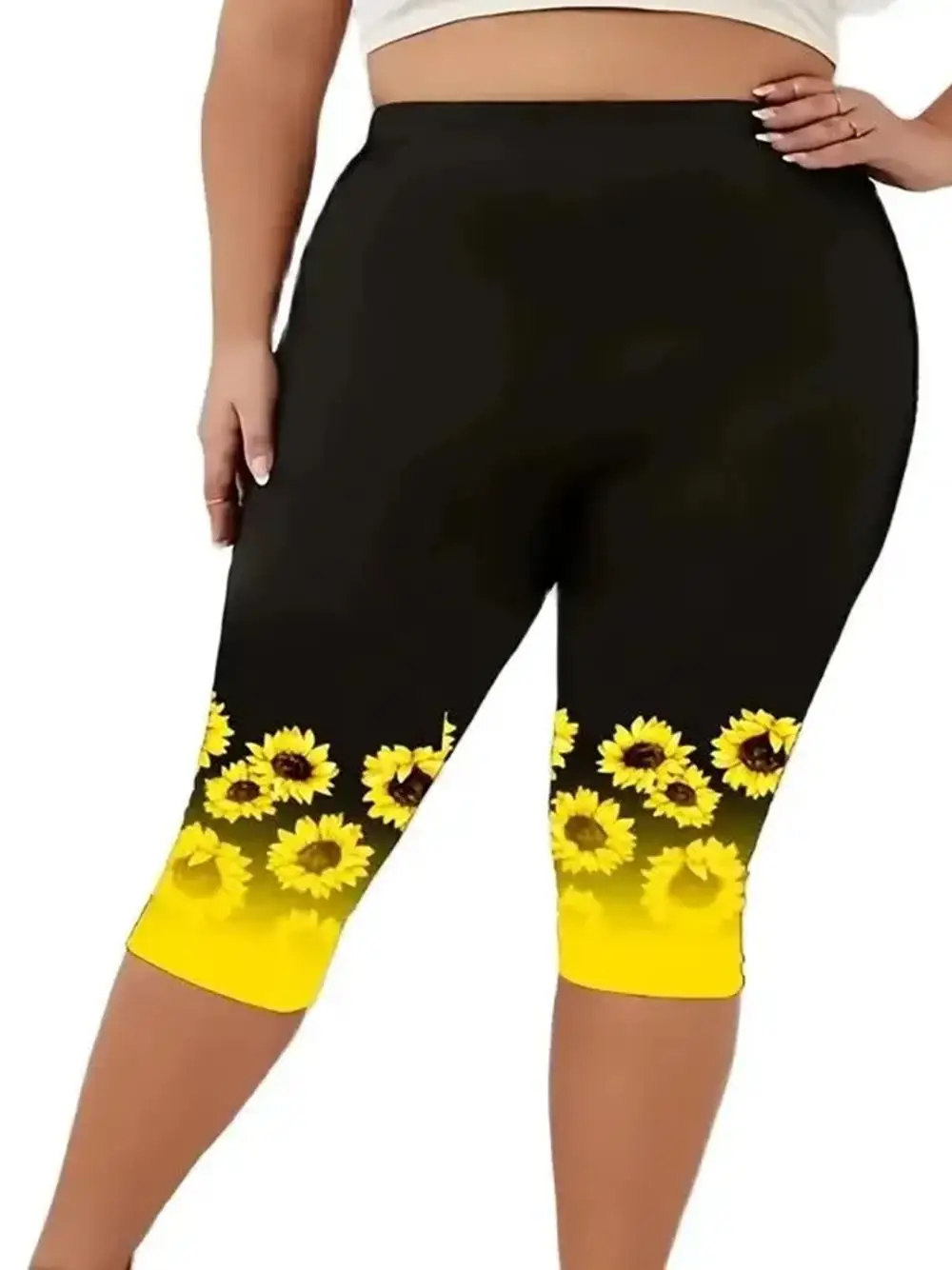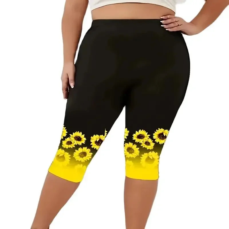 Women’s Plus Size Summer Fashion Sunflower Print Leggings Fitness Sports Seven Point Leggings Casual Yoga Leggings