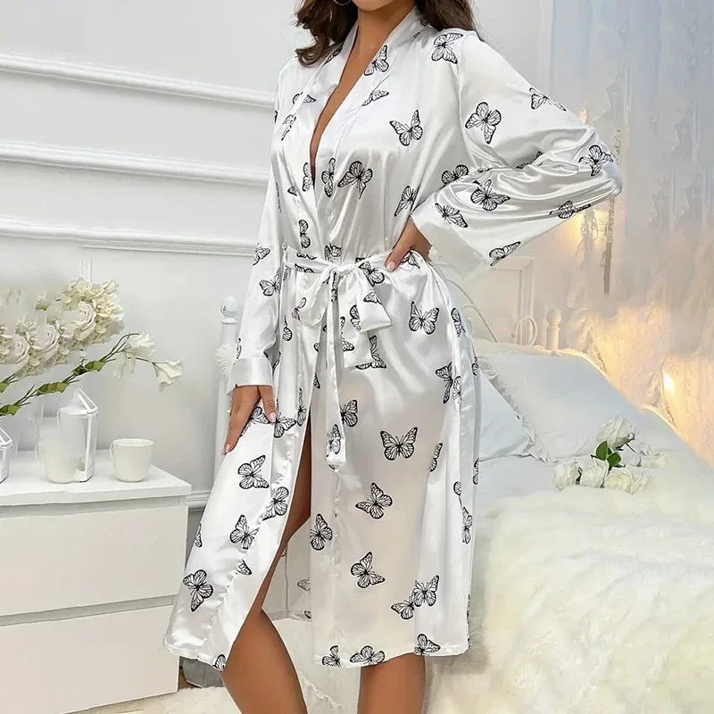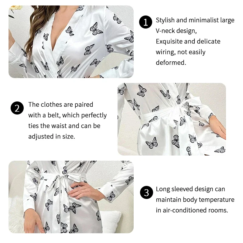 Women’s Satin Nightdress Kimono Robes Bathrobes Sexy Sleepwear V Neck Long Sleeve Pajamas Loose Nightgowns Nightie Pyjama Female