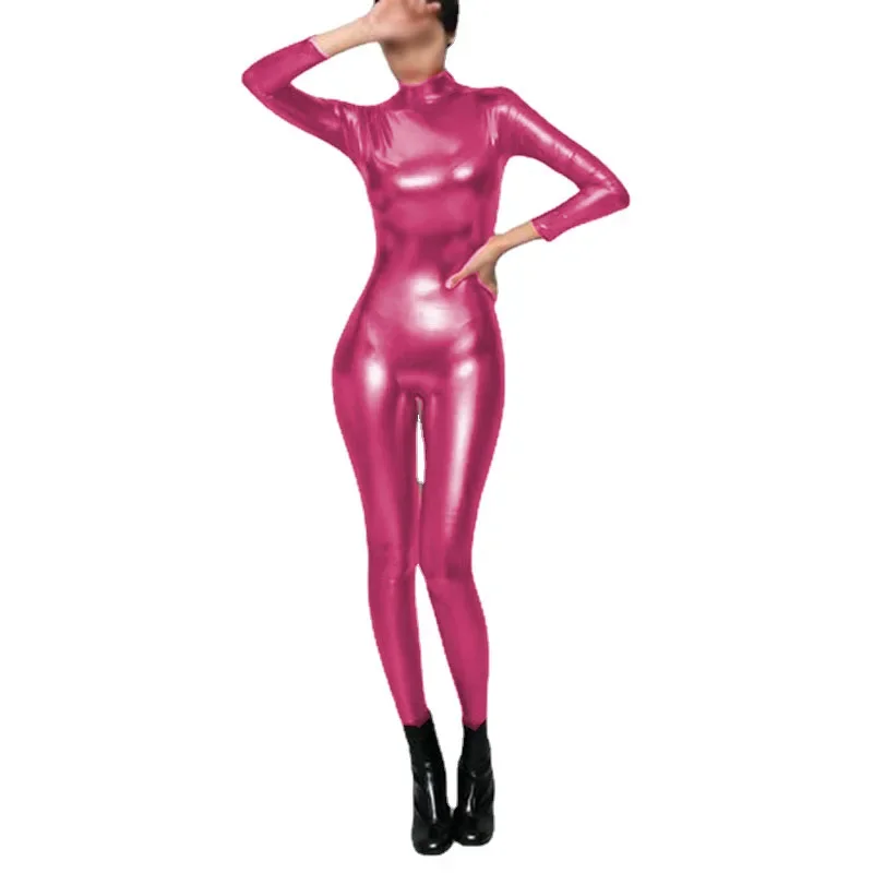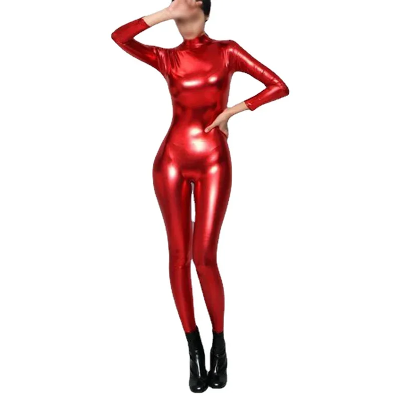 Women’s Shiny Metallic Long Sleeve Jumpsuit, Club Bodysuit, Pole Dance, Zip Back, Vinyl, Party Cosplay Catsuit, Sexy Lady