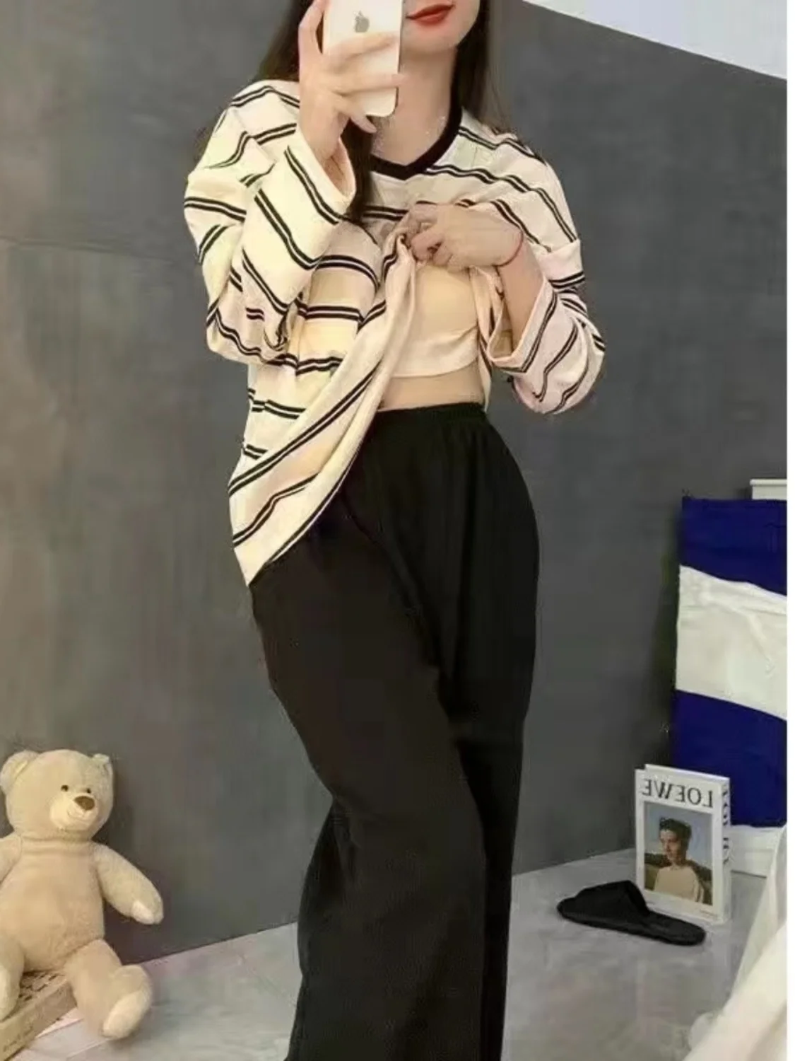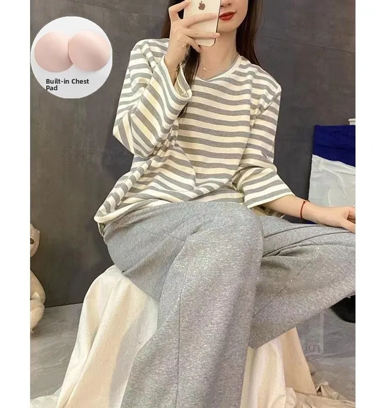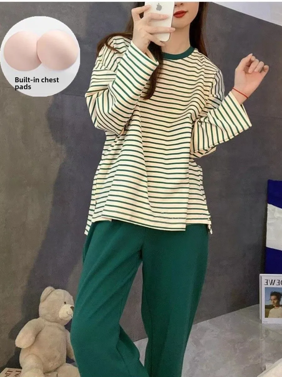 Women’s Spwear with Chest Pad Thin Long Sve Striped Home Clothes Two-Piece Set Spring Autumn Winter New Arrival
