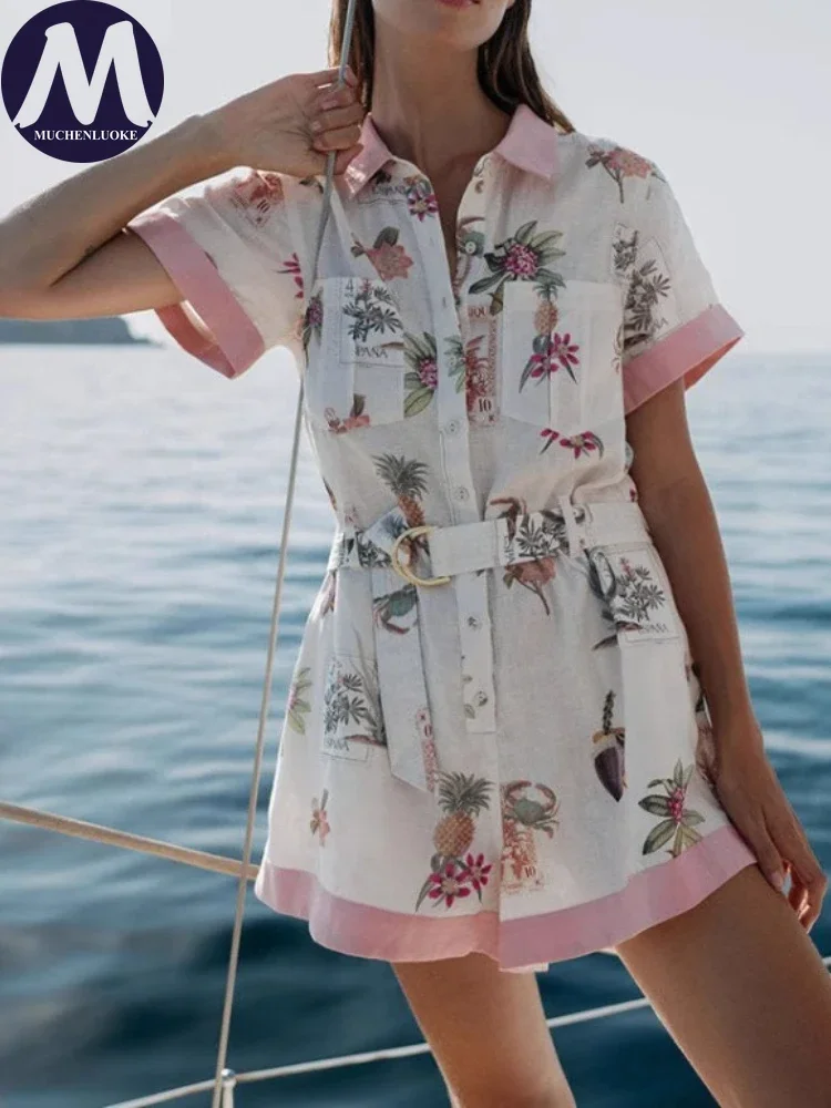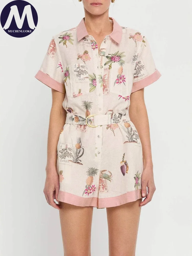 Women’s Summer Jumpsuit 2025 New Printed Half Sleeve Lapel Shirt Jumpsuit Fashionable Casual Loose Belt Women Jumpsuit Shorts
