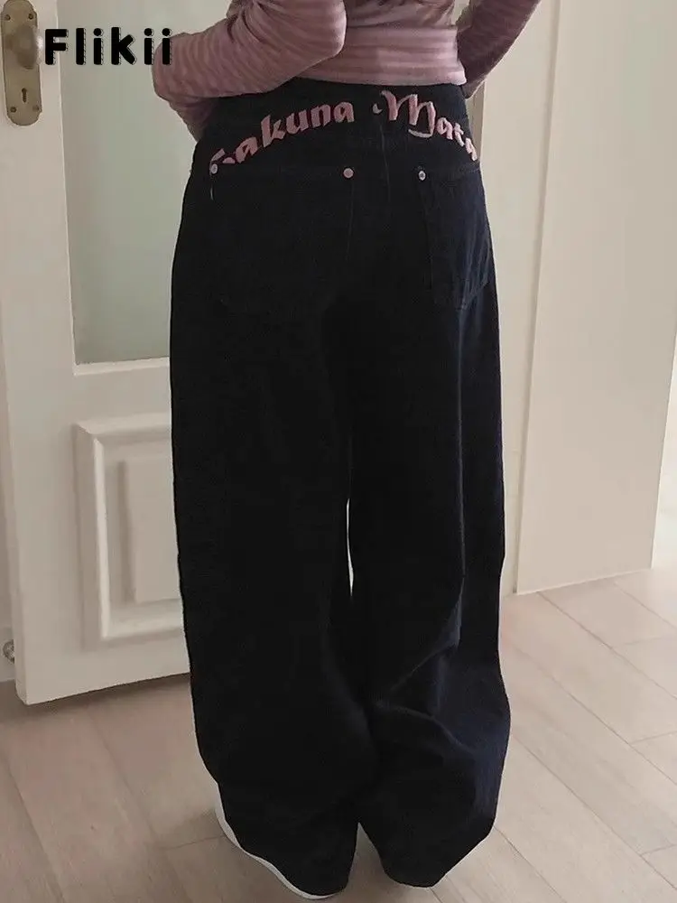 Women’s Sweet Casual Full Length Baggy Denim Trouser Retro Emo Harajuku Loose Jeans Letter Embroidery High Waist Y2K 2000s Pants
