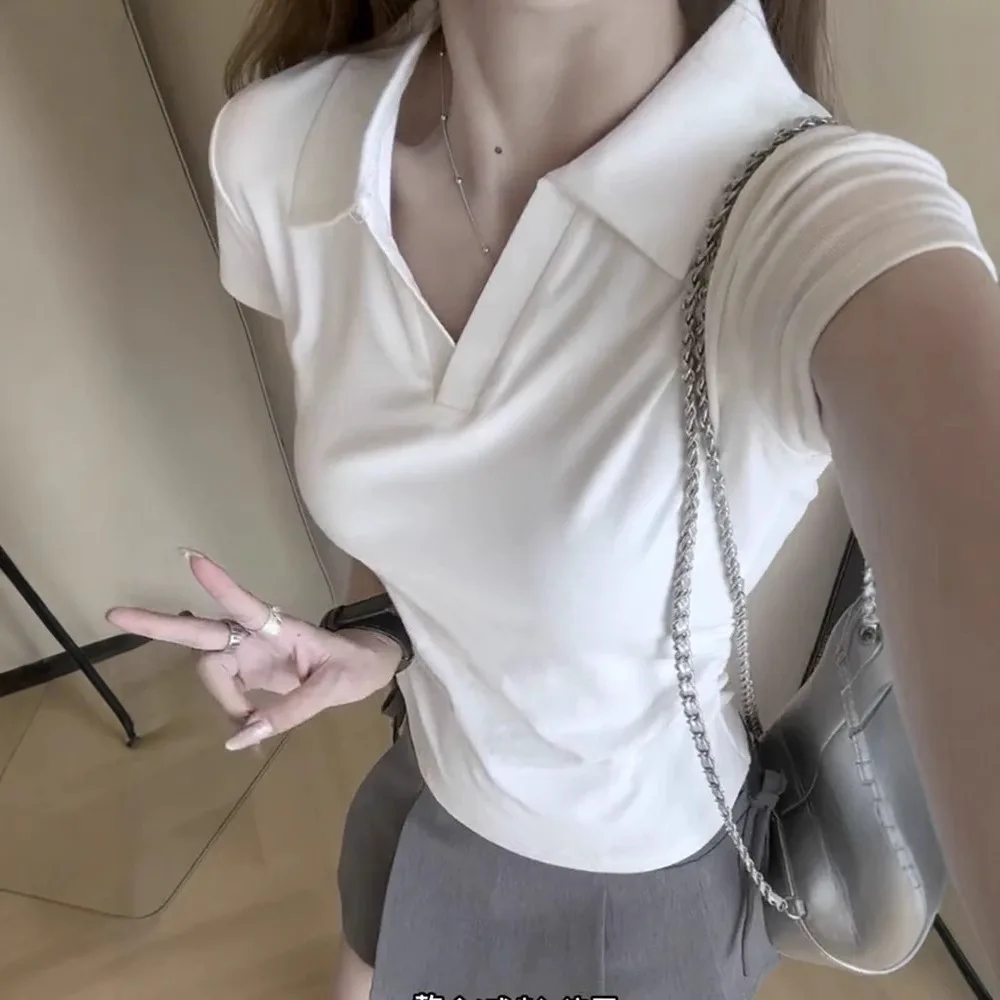 Women’s Sweet Spicy Cropped Polo T-Shirt Summer Fitted Waist Ruffled Short Sleeve Top Trend V Neck Tees Casual Wear Slim Fit