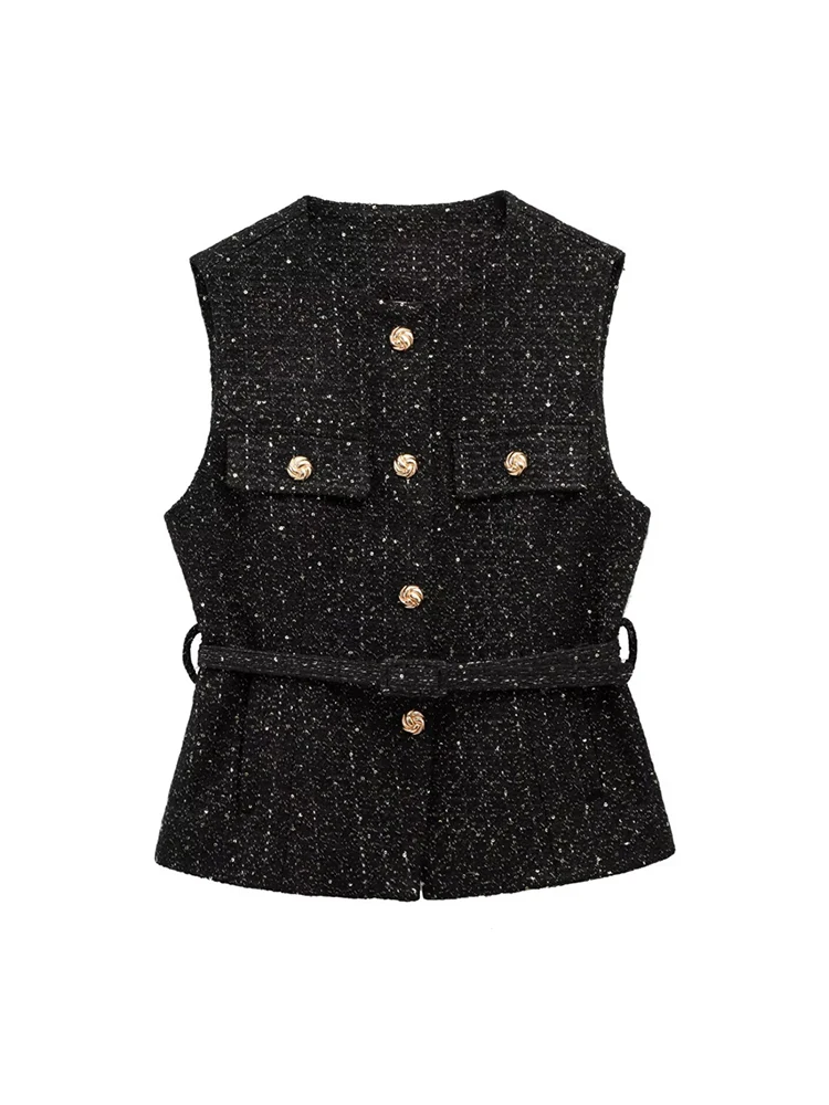 Women’s Tweed Waistcoat with Belt, O Neck, Sleeveless, Front Button, Female Outerwear, Chic Tops, Fashion