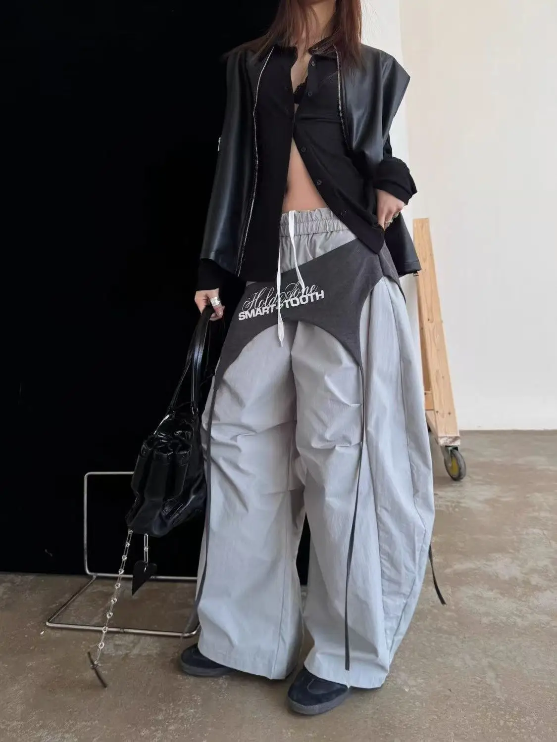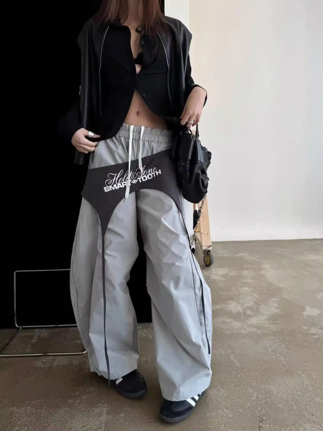 Women’s Y2K Style Wide Leg Cargo Pants Cross-layer Straps Design Casual Hip Hop Dance Streetwear Trousers