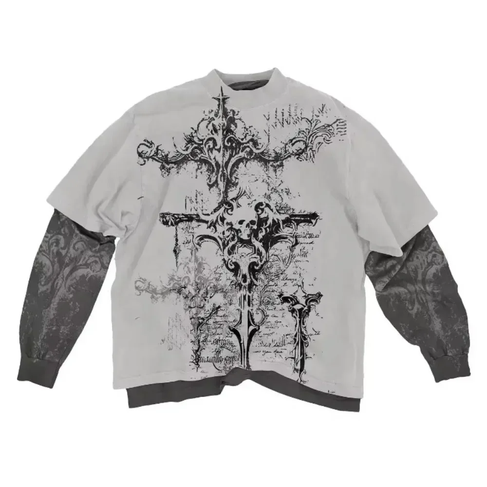 Y2K american skull pattern long sleeved T shirt Fashion Round Neck Oversized T shirt New Mens Womens Casual Gothic Clothing Tops