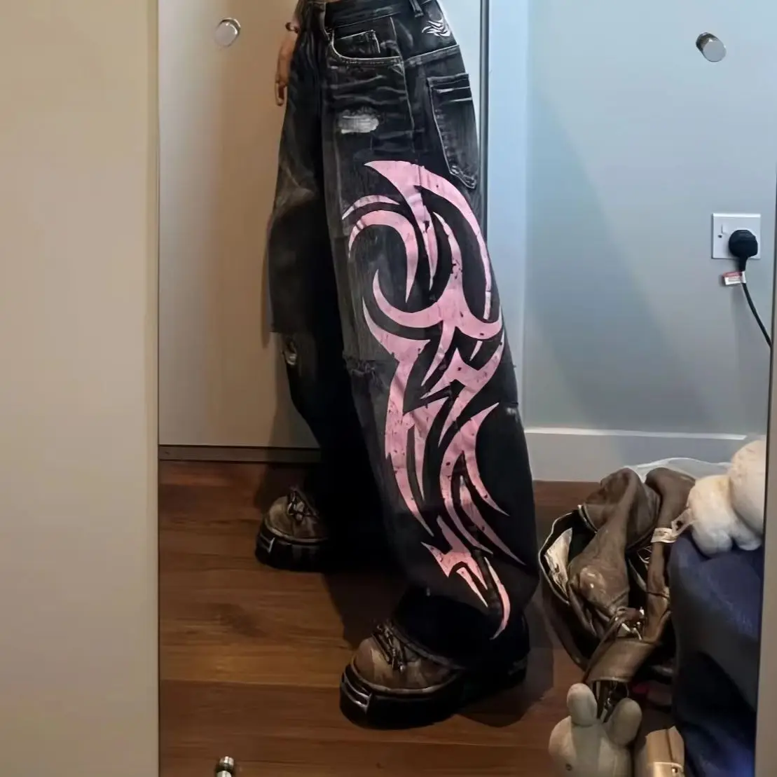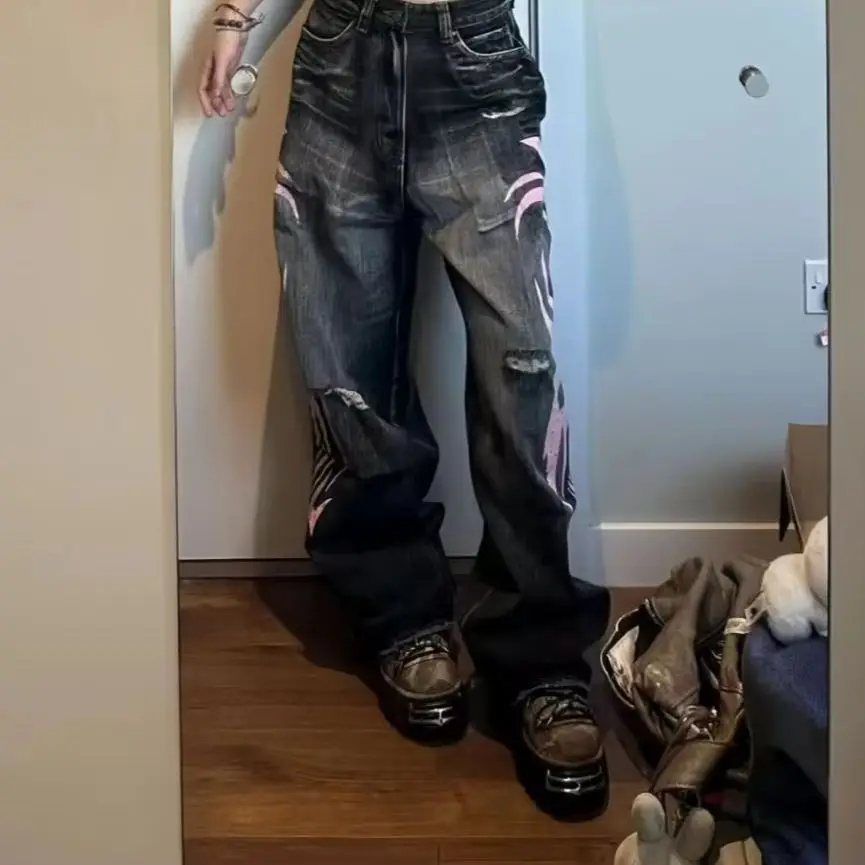 Y2K American Vintage Mottled Totem Print Baggy Jeans Women’s High Waist Wide Leg Jeans Women’s Harajuku Trendy Hip-hop Jeans
