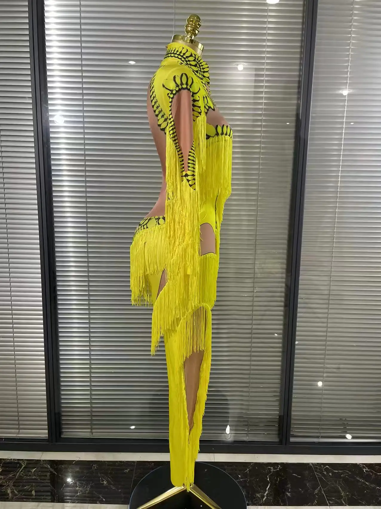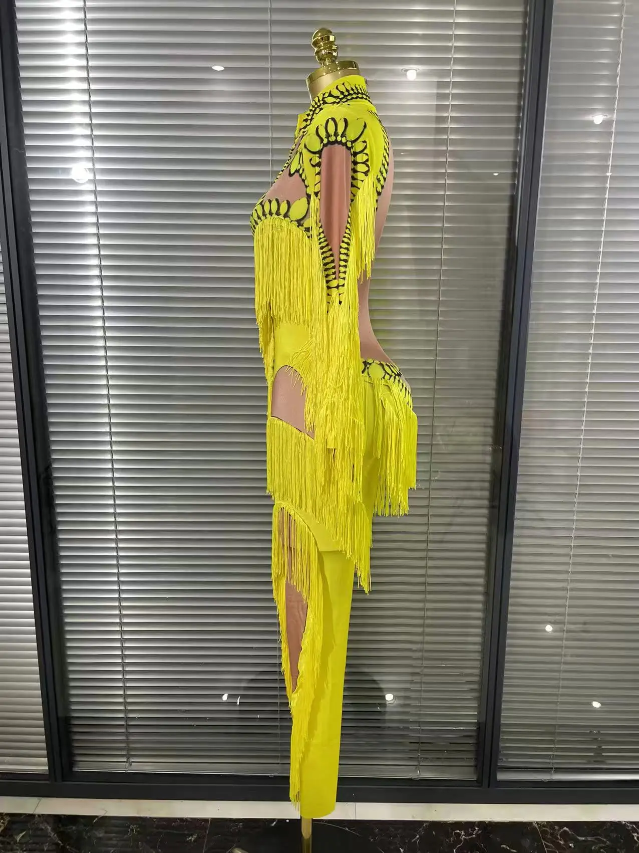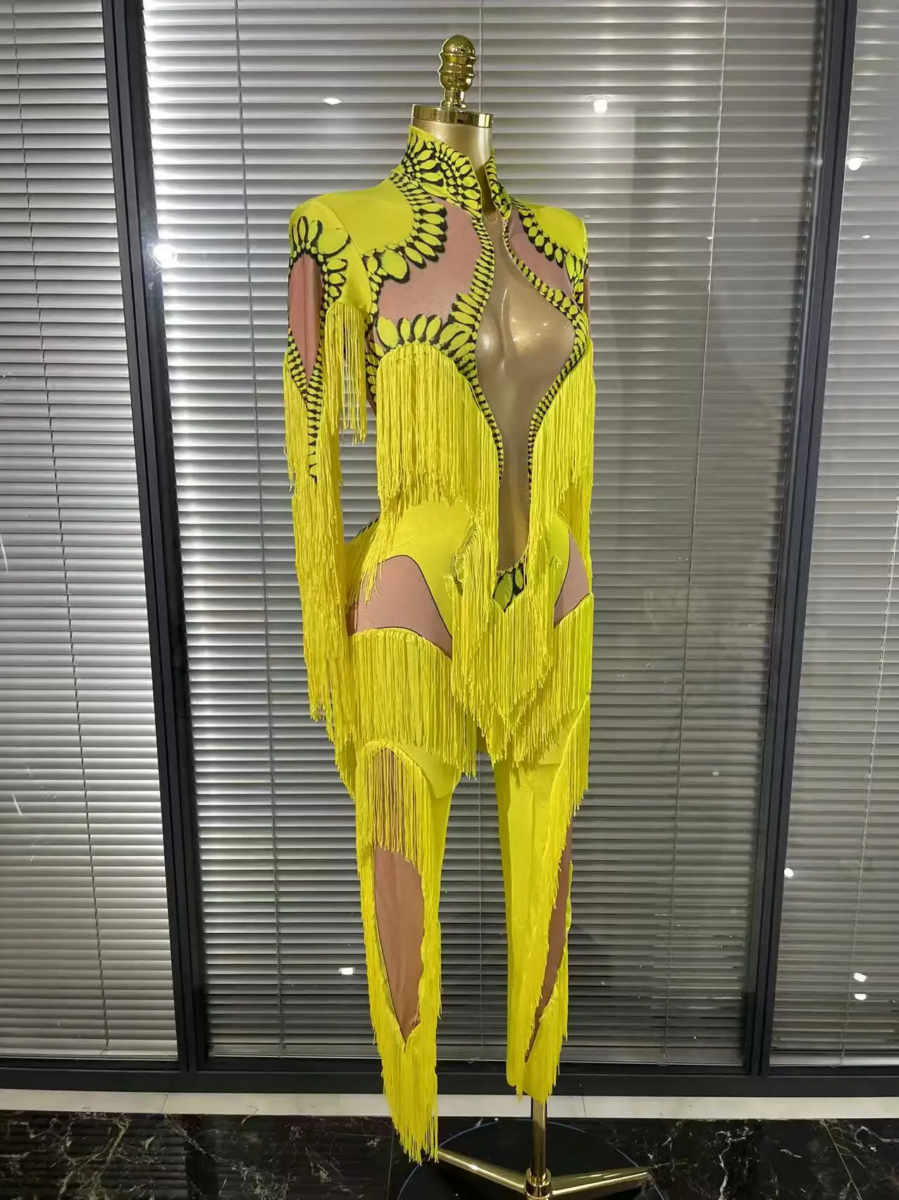 Yellow Tassel Jumpsuit Women Long Sleeve Spandex Skinny Fringe Leotard Sexy Stage Wear DJ Singer Dancer Party Show Costume