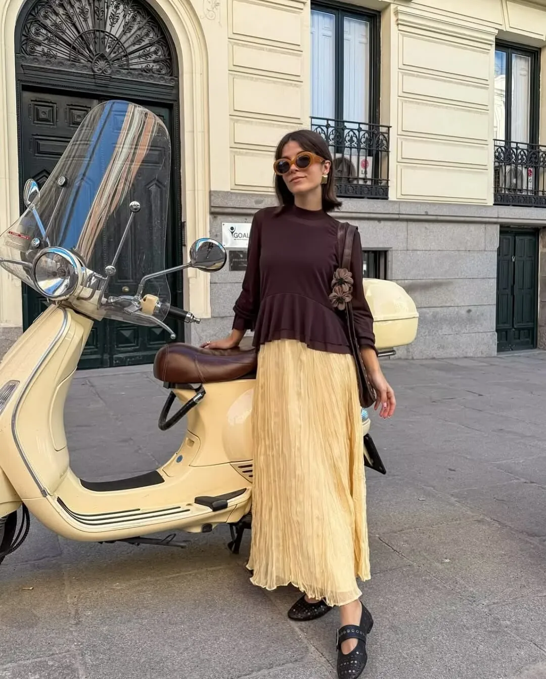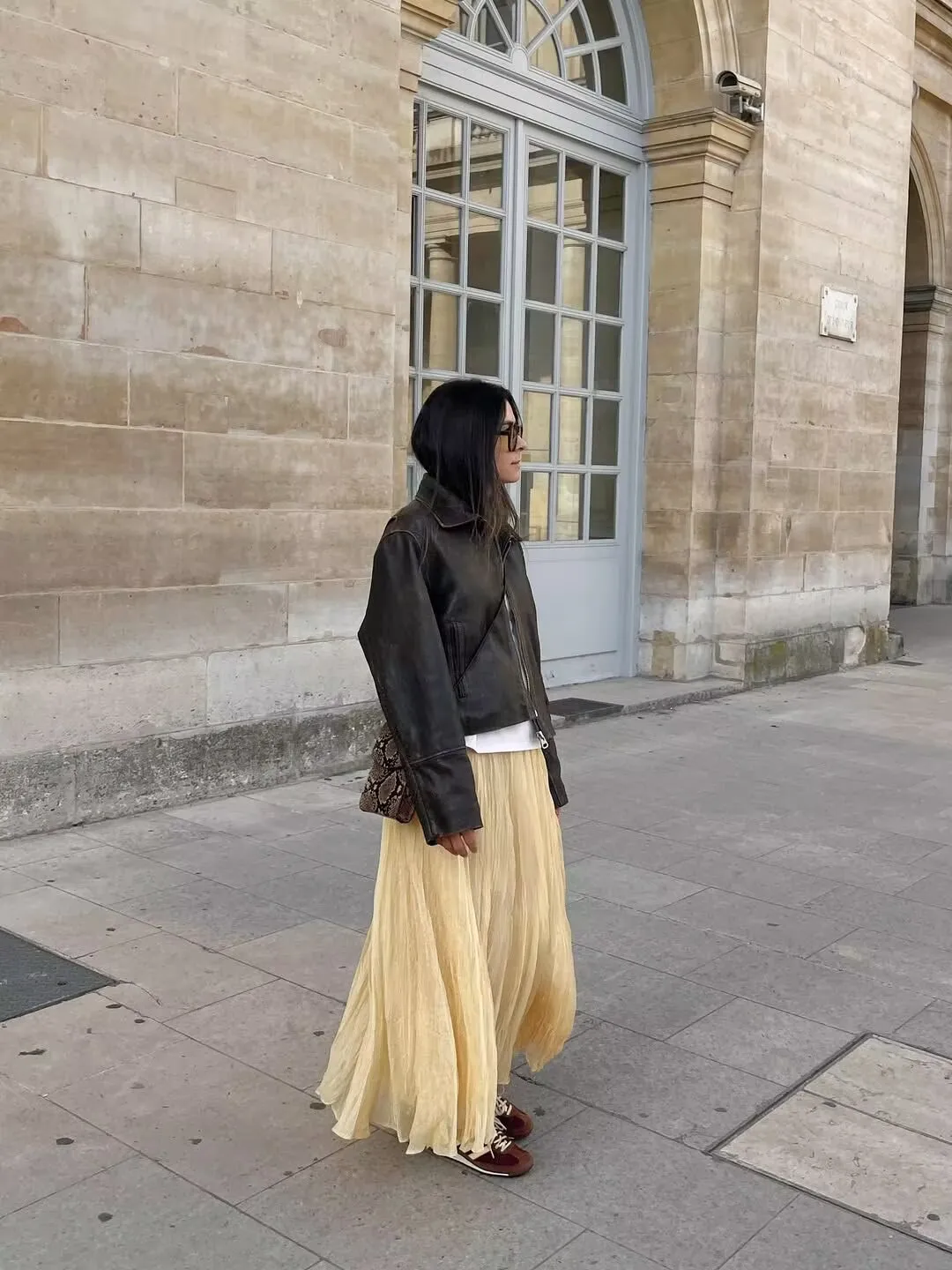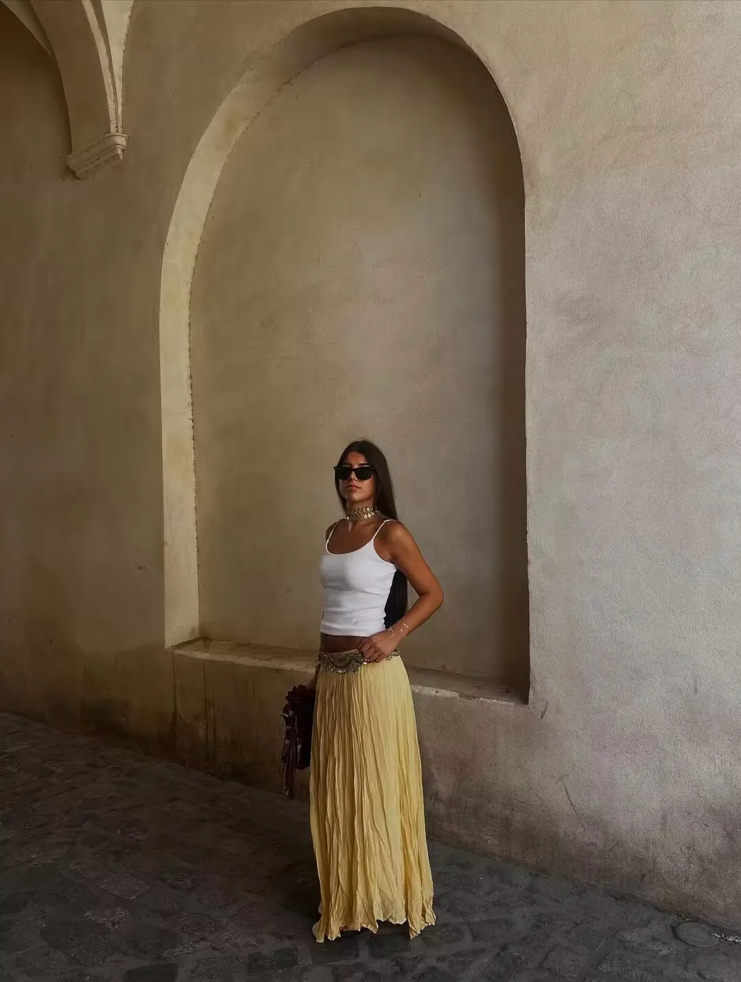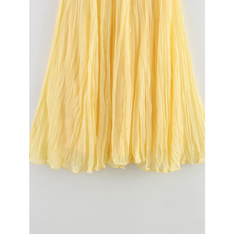 YENKYE Women Crinkle A-line Midi Butter Yellow Skirt Elastic Waist Spring Summer Holiday Elegant Skirts New 2025 faldas mujer