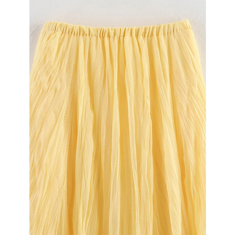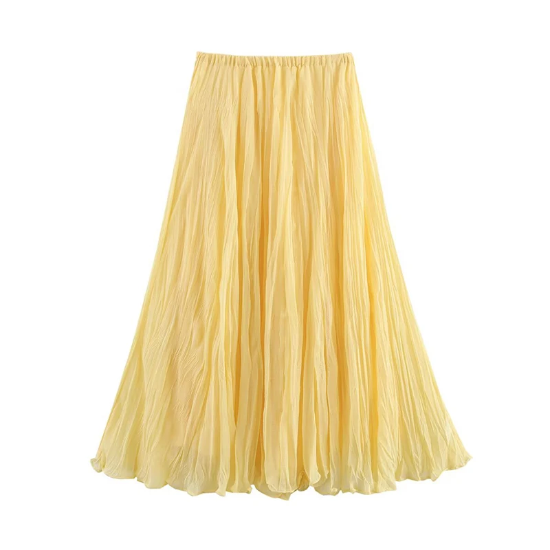 Women Crinkle A-line Midi Butter Yellow Skirt Elastic Waist Spring Summer Holiday