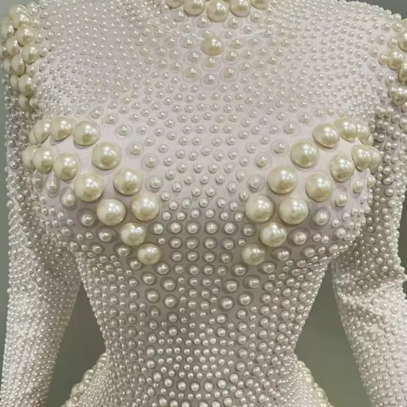Yiling white pearl long-sleeve sexy elastic tight-fitting jumpsuit club party dress DJ female singer stage performance clothing