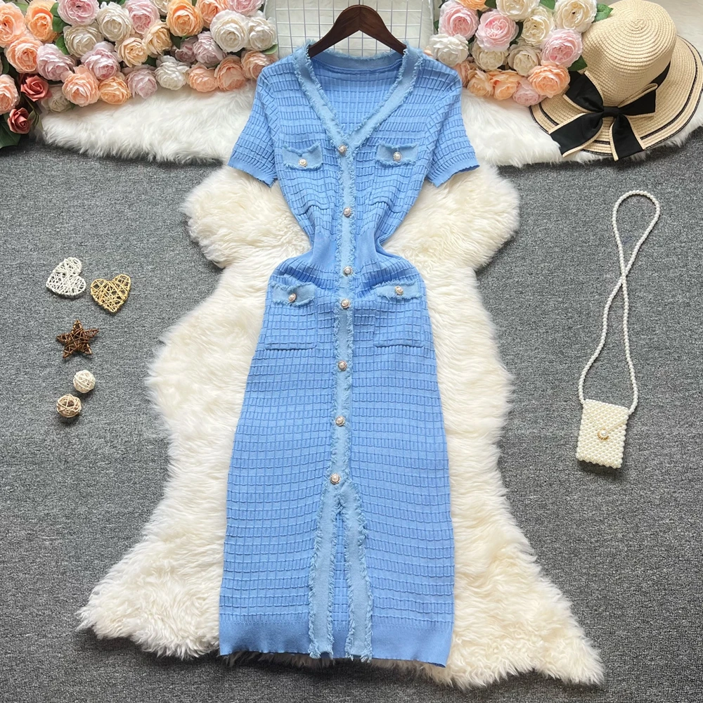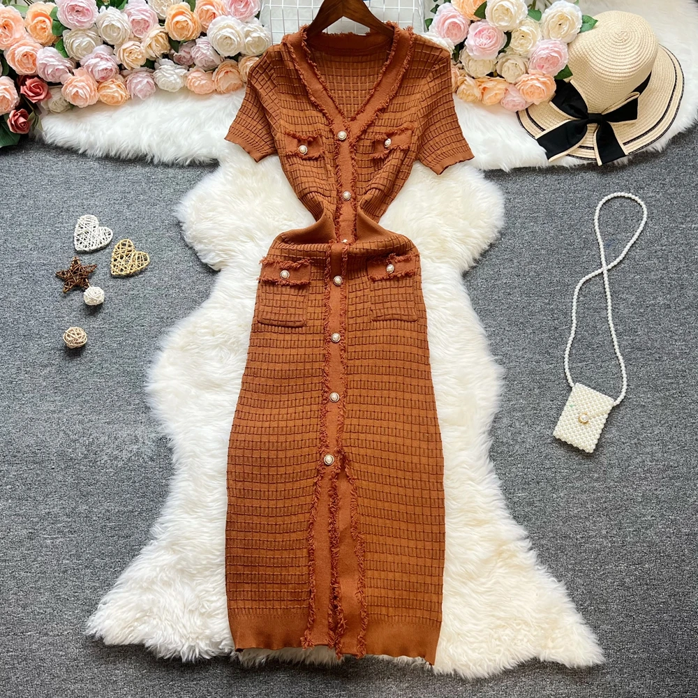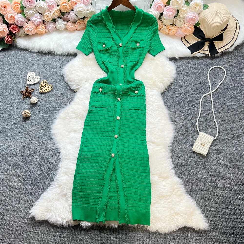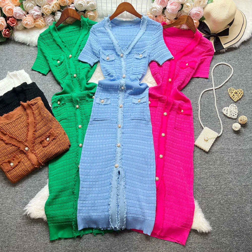 YuooMuoo Chic Fashion Sexy Package Hips Knitted Dress Women V-neck Single-breasted Bodycon Sweater Dress Office Lady Vestidos