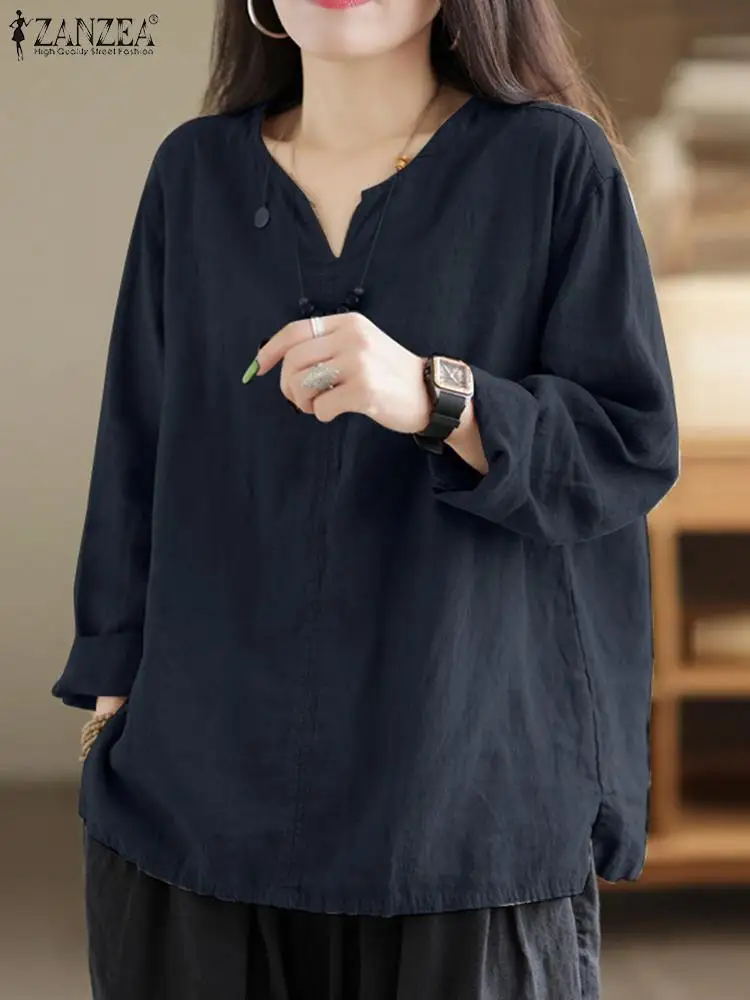 ZANZEA Autumn Women Vintage Cotton Blouse Fashion Solid Loose Shirt Work Tunic Blusas Mujer 2024 Female V Neck Long Sleeve Tops