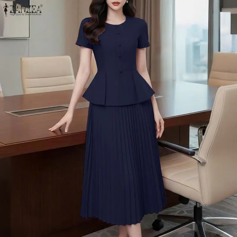 ZANZEA Elegant 2 Piece Outfits Women Short Sleeve Solid Top Tunic Long Skirts Summer Dress Sets Casual Office 2pcs Streetwear