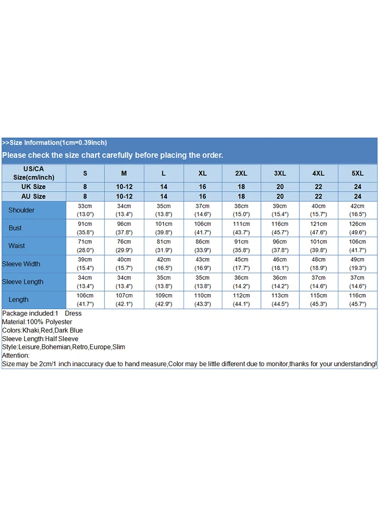 Material:100% Polyester Colors:Khaki,Red,Dark Blue Sleeve Length:Half Sleeve Neckline:,O-Neck Pattern:Solid Color Length:Mid-Calf Length Buckle chain:With Back Zipper,Button Cuffs Thickness:Thin Features:Puff Sleeve Style:Leisure,Bohemian,Retro,Europe,Slim Season:Spring,Summer,Autumn Occasion:Family,Party,Beach,Wedding,Holiday,Employment Label: Yes Attentions: 1.The Real Object May Exist Slightly Colors Differences Compared To Images As Different Computers Display.Caution If Minding,Thanks. 2.There Might Be A Manual Measuring 1-3 cm Error.Sorry For Any Inconvenience. 3.Please Prevail On Real Item, Model Images For Reference Only. 4.Attention!!!Please check the size chart carefully before placing the order. |
