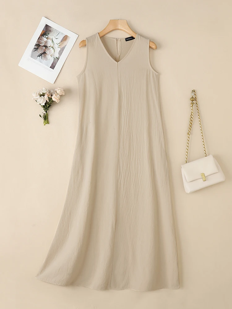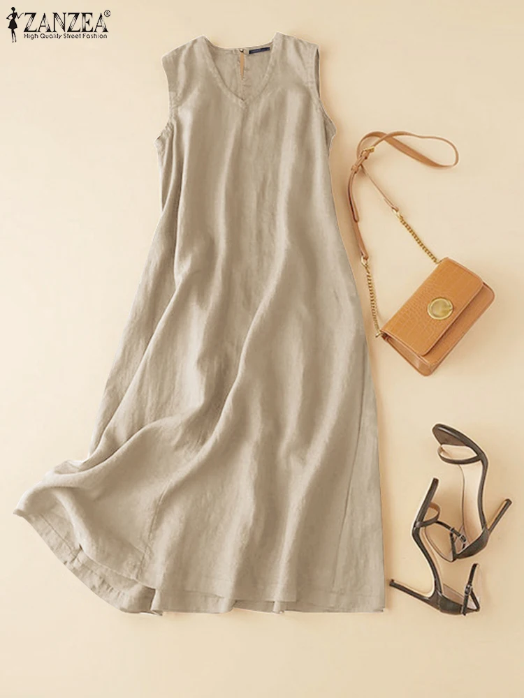 ZANZEA Plus Size Cotton Sleeveless Dresses 2025 Summer Womens Casual V Neck Solid Sundress Loose Vestidos Vintage Robes Femme