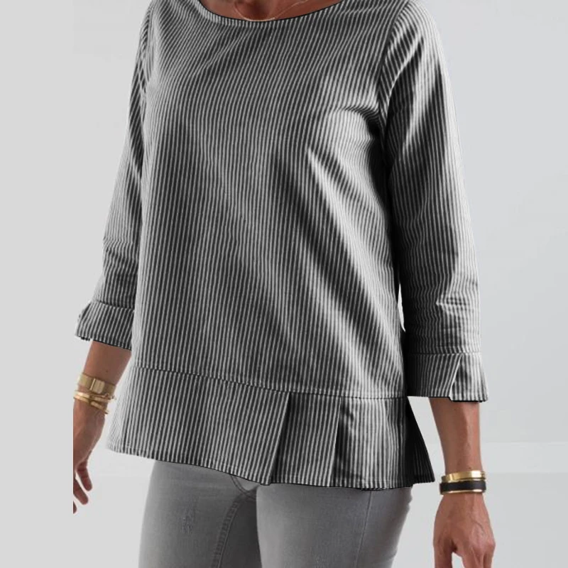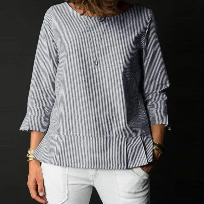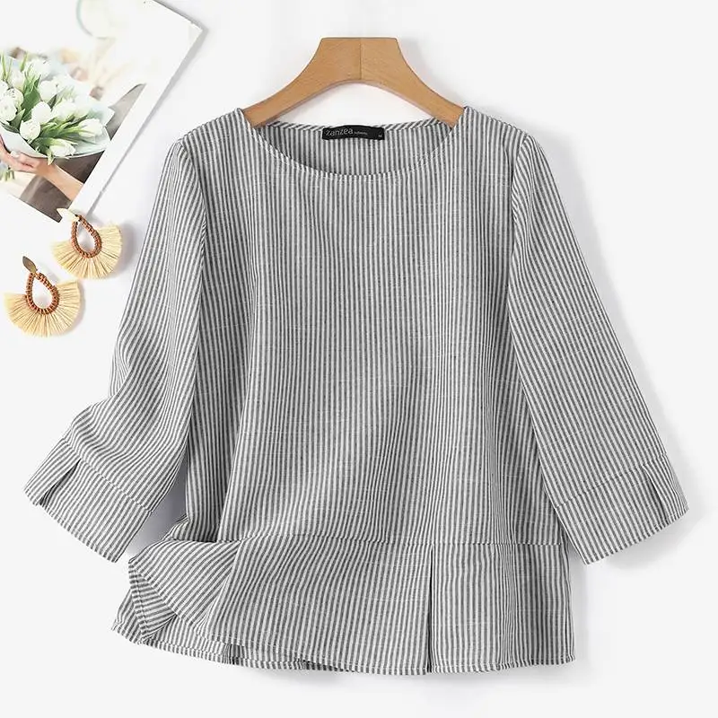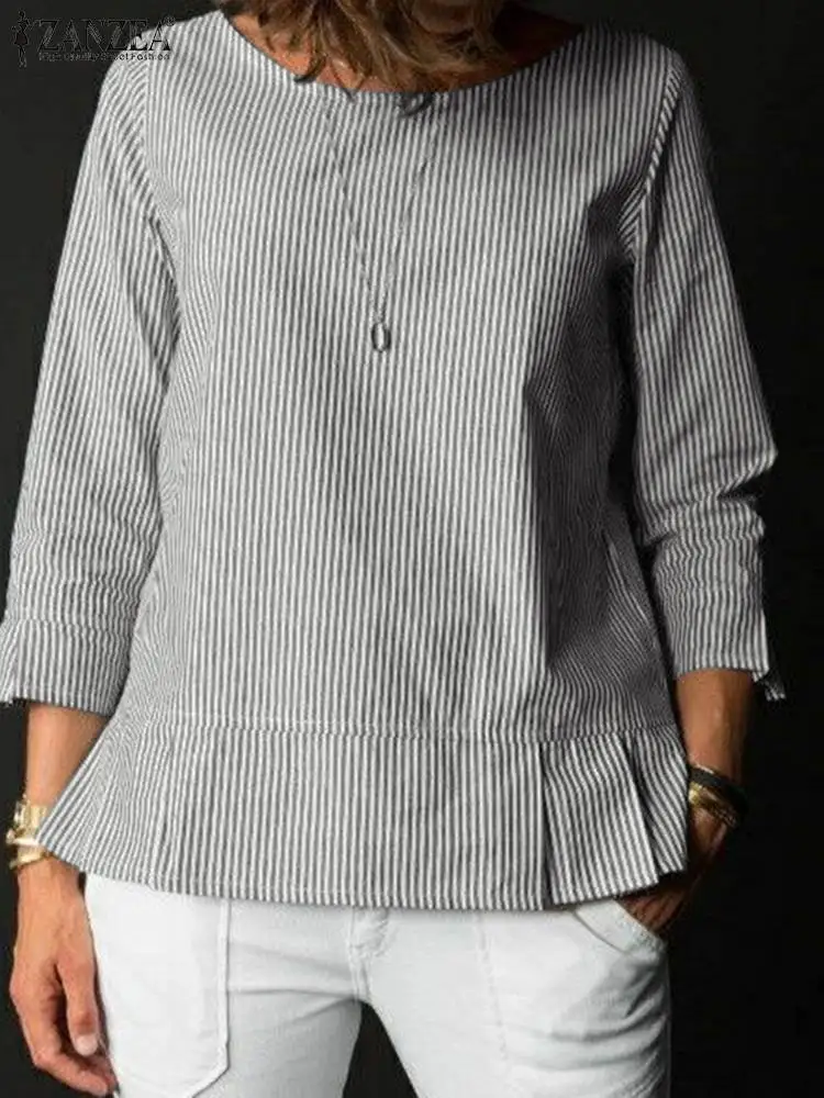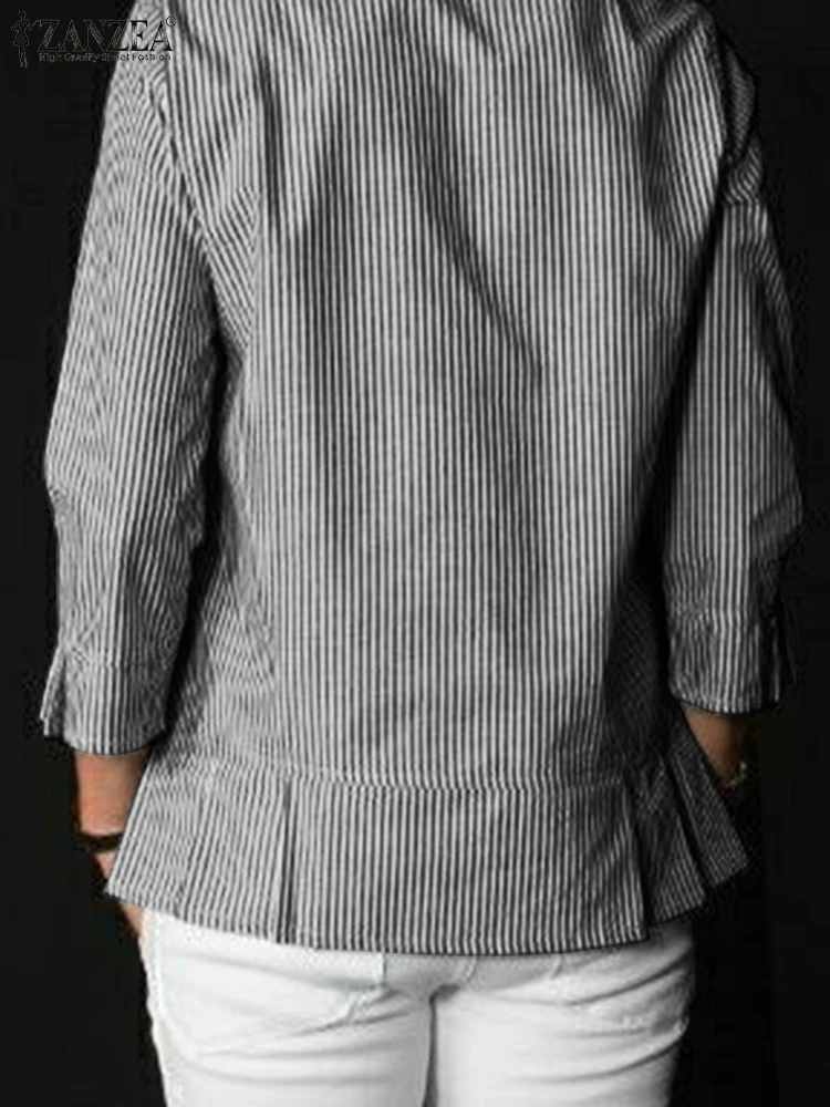 ZANZEA Stylish Women O Neck 3/4 Sleeve Blouse Autumn Striped Shirt Elegant Ruffles Work Blusas Casual Holiday Tops Tunic Chemise
