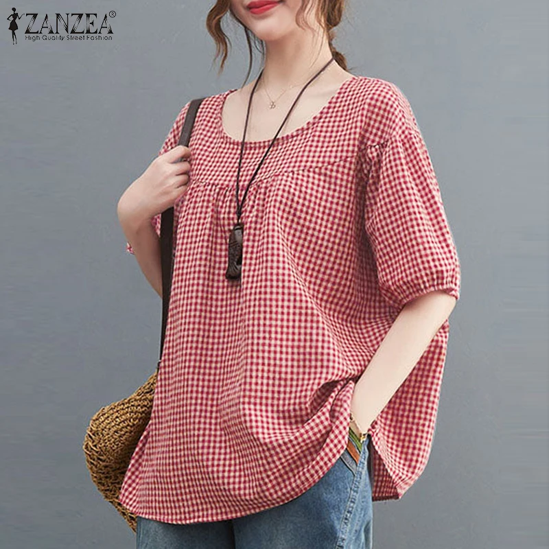 ZANZEA Summer Vintage Women Casual Loose Shirt Baggy Plaid Checked Tops Tunic Fashion O Neck Short Sleeve Blouse Blusas Chemise