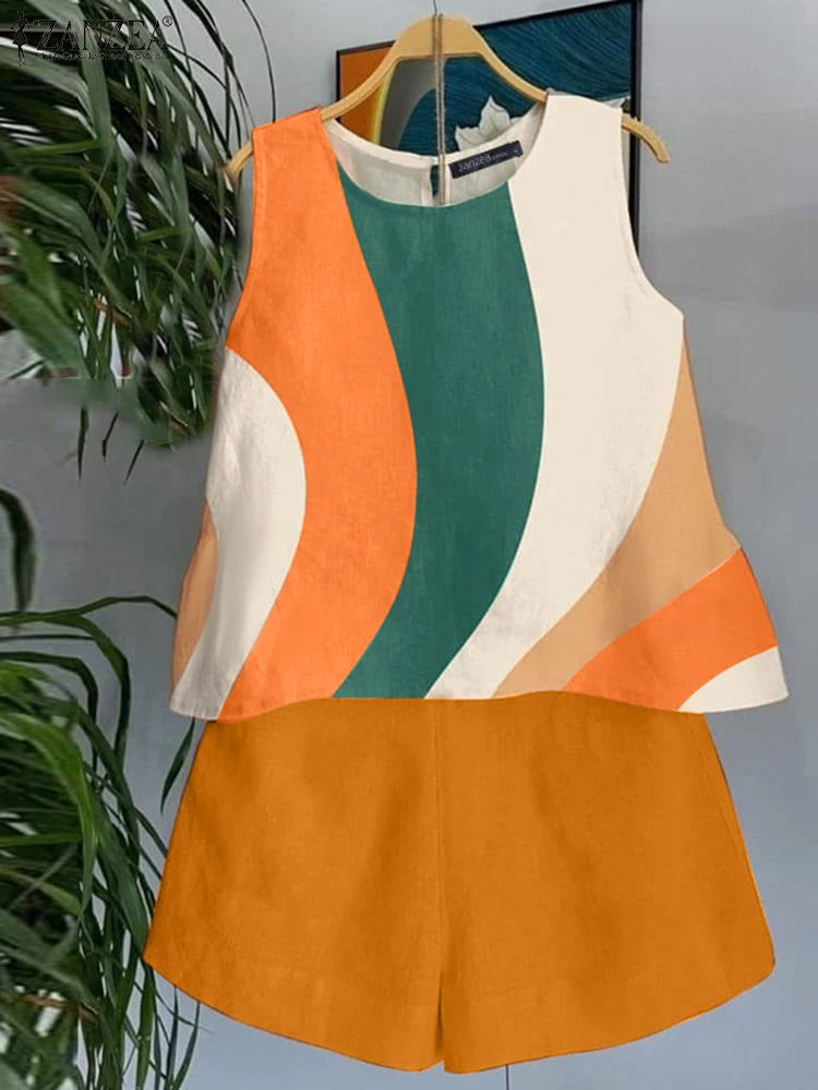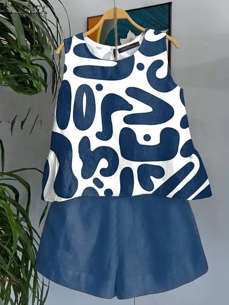 ZANZEA Women 2PCS Short Sets 2025 Summer Printed Tanks Short Suit Holiday Stitching Pleats Outfits Casual Loose Matching Sets