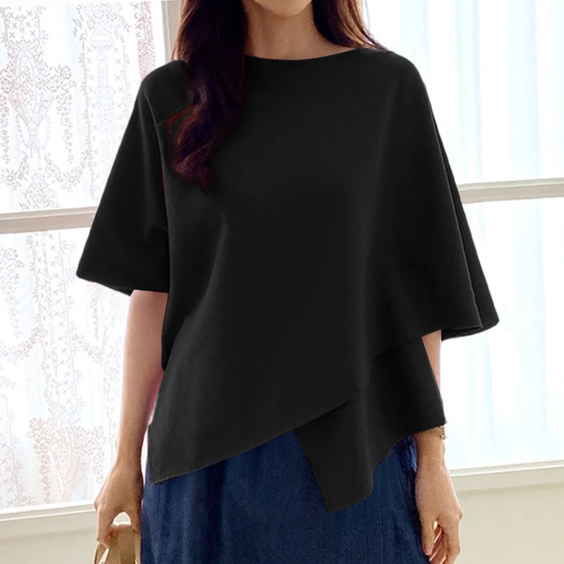 ZANZEA Women Fashion Blouse Chic 3/4 Sleeve Ruffle Hem Top Shirt 2025 Summer Round Neck Loose Blusa Elegant Irregular Work Tunic