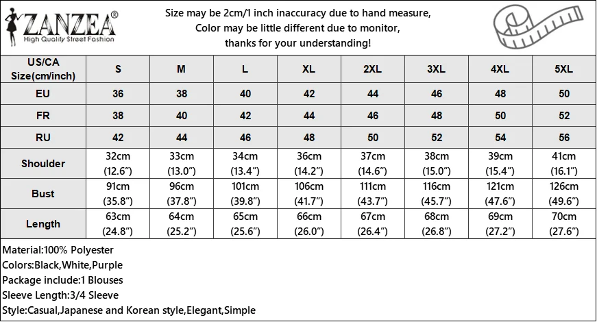 Material:100% Polyester Colors:Black,White,Purple Package include:1 Blouses Cutting:Loose Stretch:Not Stretchable Collar:Boat neck Sleeve Style:Regular Sleeve Length:3/4 Sleeve Pattern:Solid Thickness:Standard Style:Casual,Japanese and Korean style,Elegant,Simple Season:Spring,Autumn Occasion:Daily,Simple,Casual Label: Yes Attention: 1. Due to different computers, there may be subtle color difference between the object and the image. Please don’t shoot if you mind. Thank you. 2. There may be manual measurement error of 1-3cm. Please understand the inconvenience. 3. Please refer to the real object. The model pictures are for reference only. 4. Attention!!! Please check the size chart carefully before ordering.” |