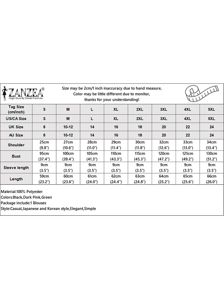 Material:100% Polyester Colors:Black,Dark Pink,Green Package include:1 Blouses Cutting:Regular Stretch:Not Stretchable Collar:Round Neck Sleeve Style:Ruffle Sleeve Decoration:Fungus Ruffled Edge,Pleated Features:Multiple layers Pattern:Solid Thickness:Standard Style:Casual,Japanese and Korean style,Elegant,Simple Season:Spring,Summer,Autumn Occasion:Daily,Simple,Casual Label: Yes Attention: 1. Due to different computers, there may be subtle color difference between the object and the image. Please don’t shoot if you mind. Thank you. 2. There may be manual measurement error of 1-3cm. Please understand the inconvenience. 3. Please refer to the real object. The model pictures are for reference only. 4. Attention!!! Please check the size chart carefully before ordering.” |