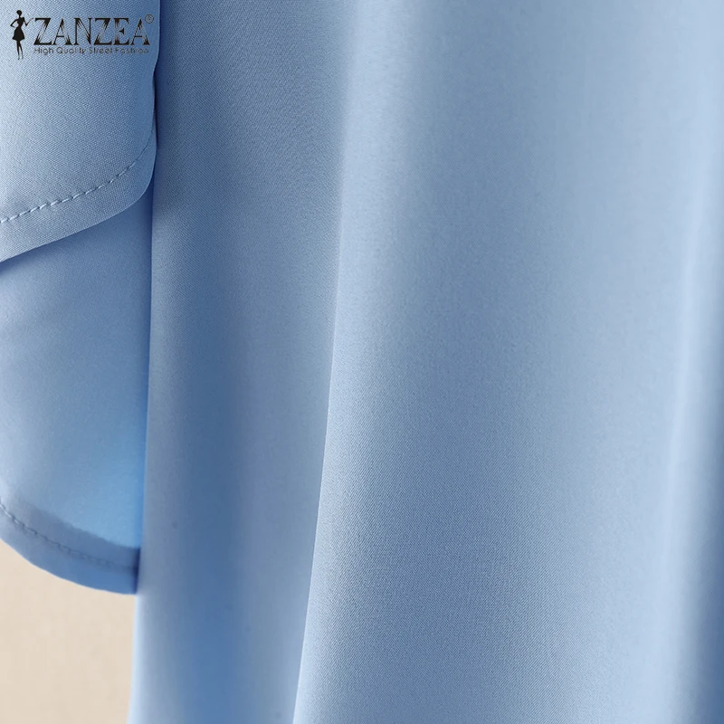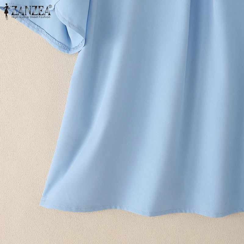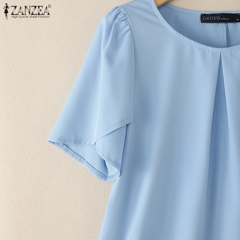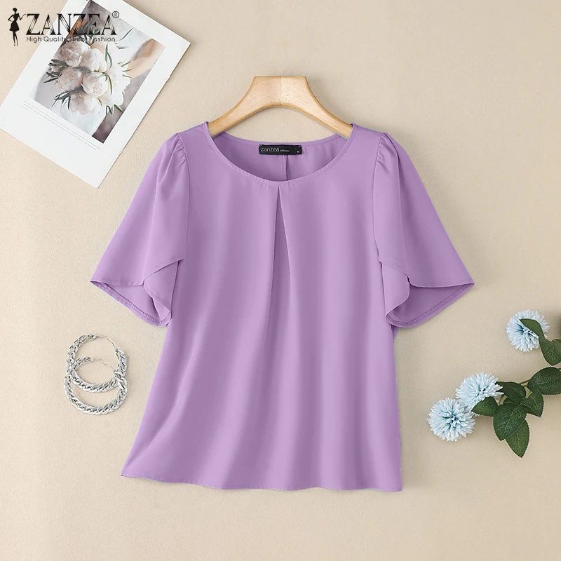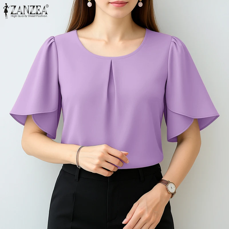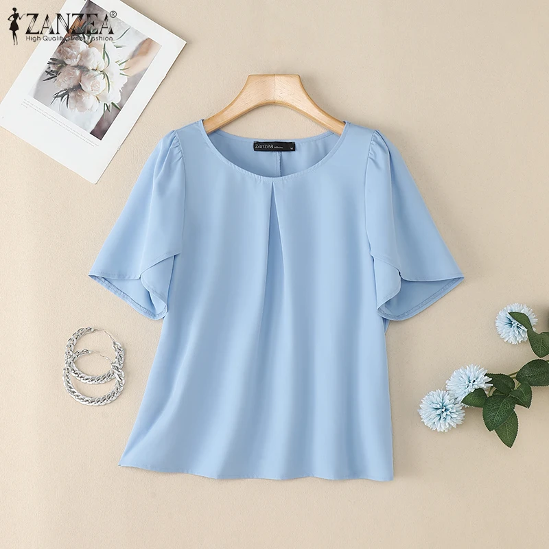 ZANZEA Women Summer OL Work Blouse Elegant Office Shirt Stylish Solid O Neck Tunic Short Petal Sleeve Tops Holiday Blusas Femme
