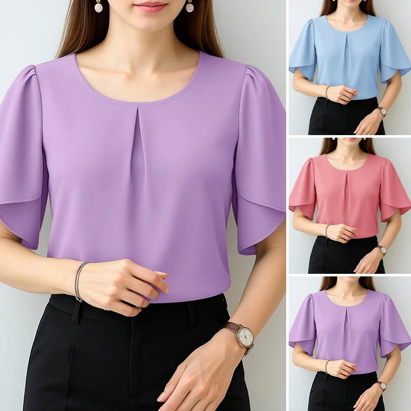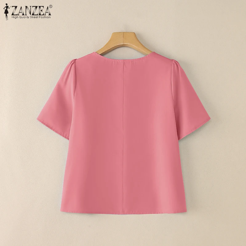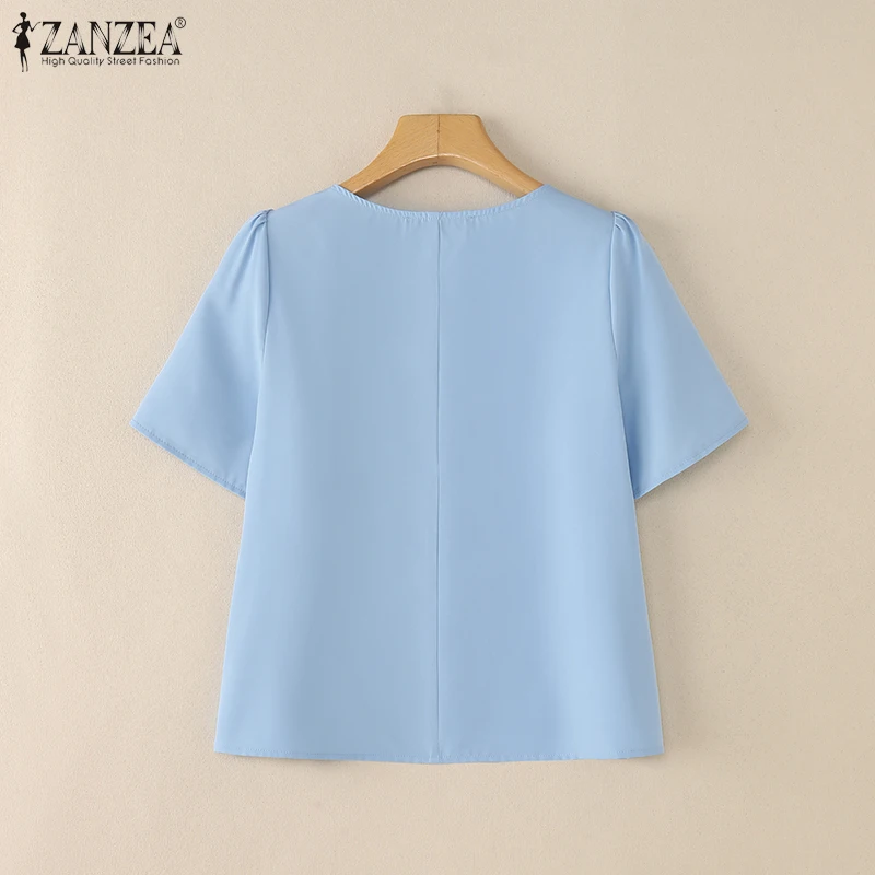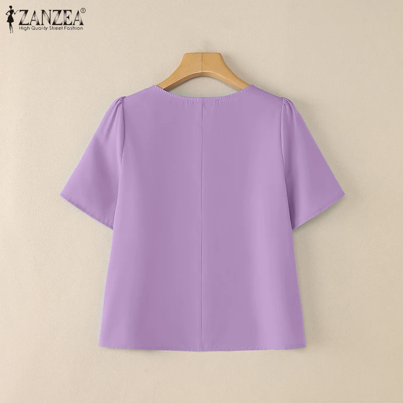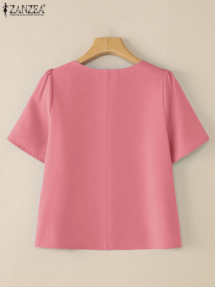 ZANZEA Women Summer OL Work Blouse Elegant Office Shirt Stylish Solid O Neck Tunic Short Petal Sleeve Tops Holiday Blusas Femme