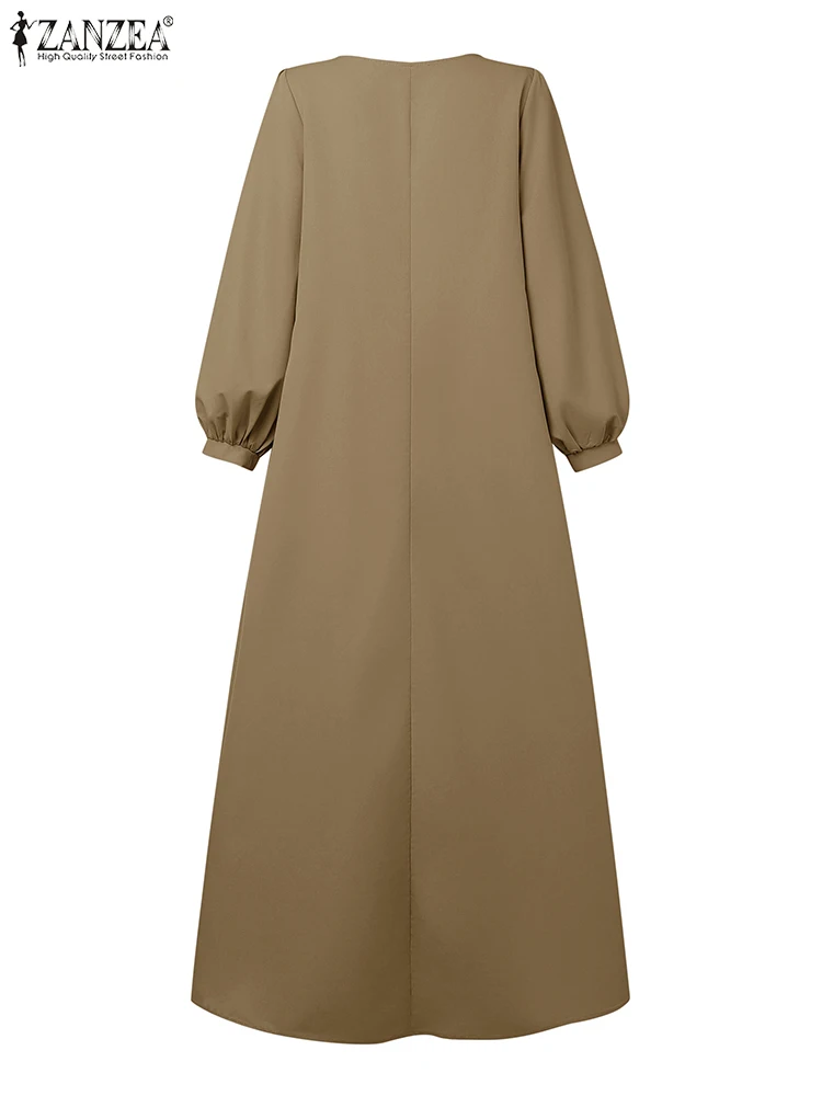 ZANZEA Womens Casual Chic Maxi Dresses Boatneck Lantern Sleeve Fake Two-Piece Solid Color A-Line Long Dress Autumn Retro Clothes