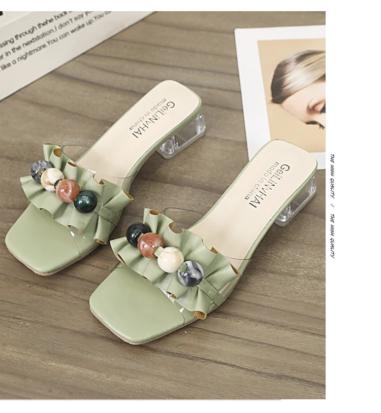 Zapatillas Frías Mujer Verano Nuevo Estilo Francés Transparente Cuentas Plisadas Con Arrastre Fresco De Playa En Cristal