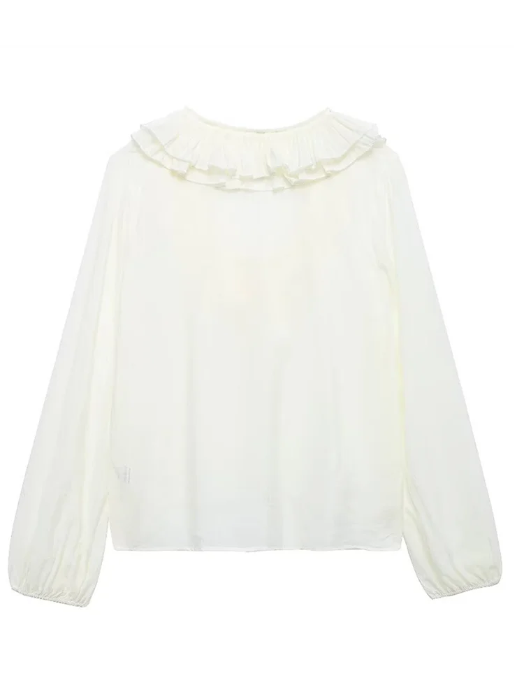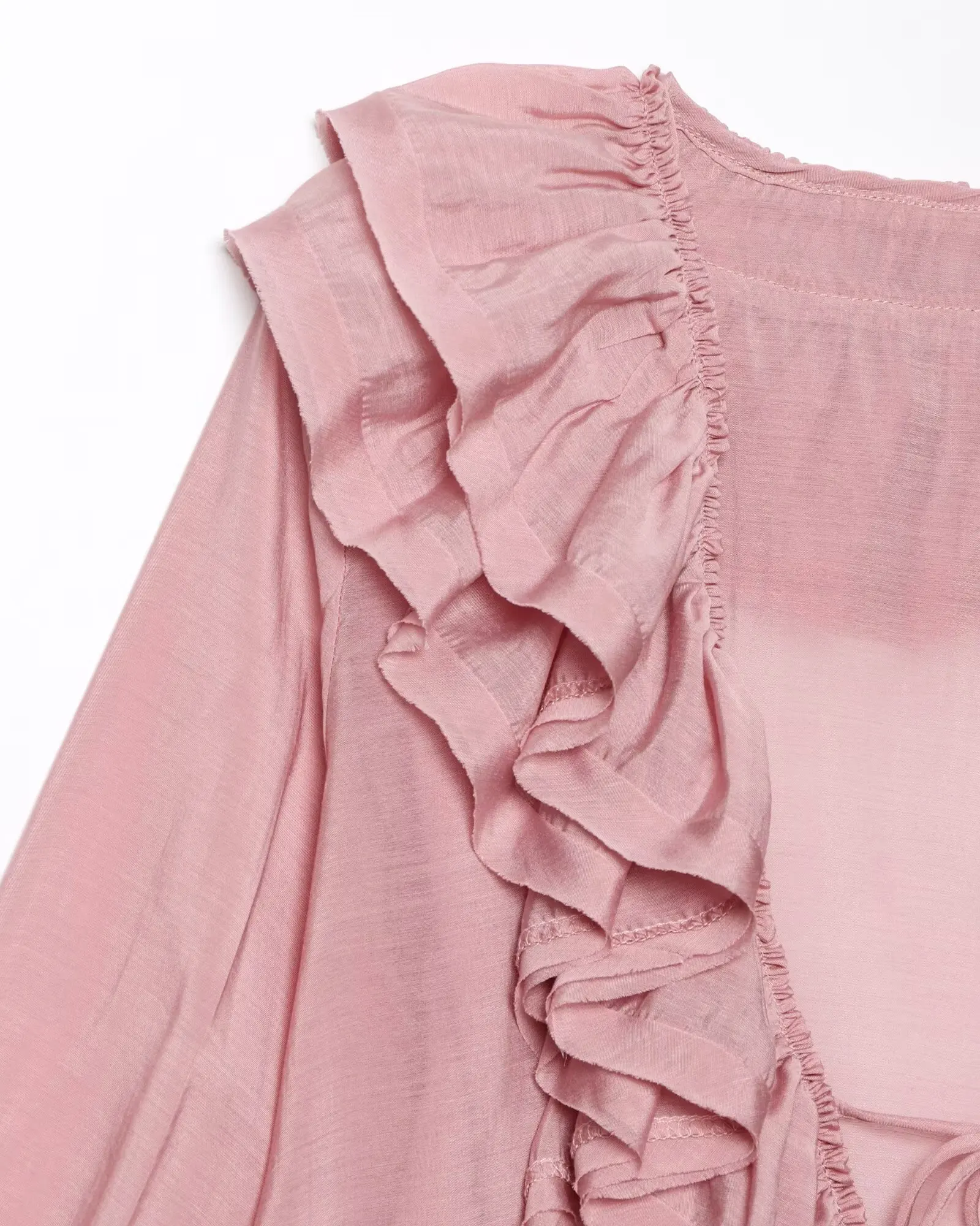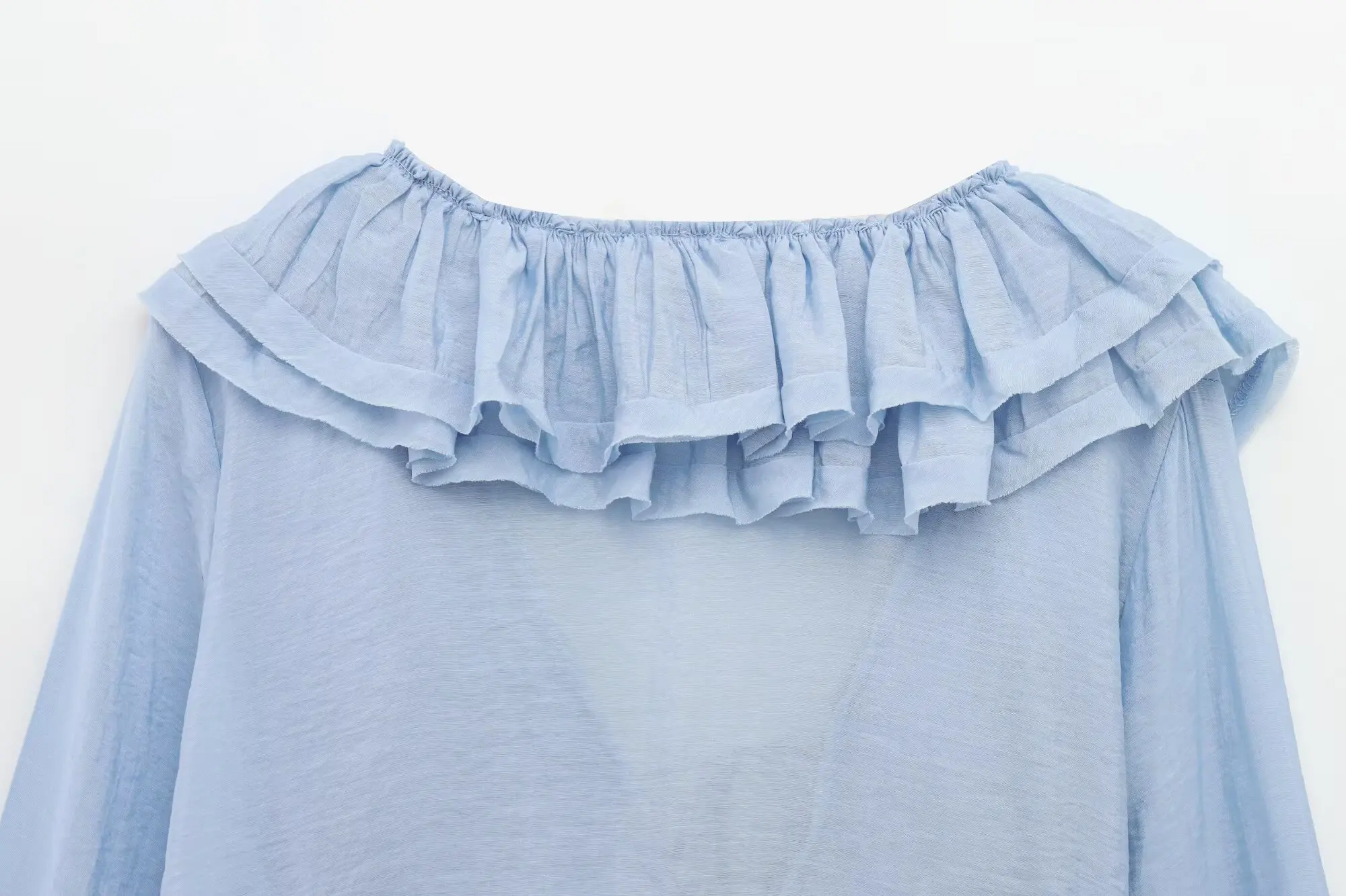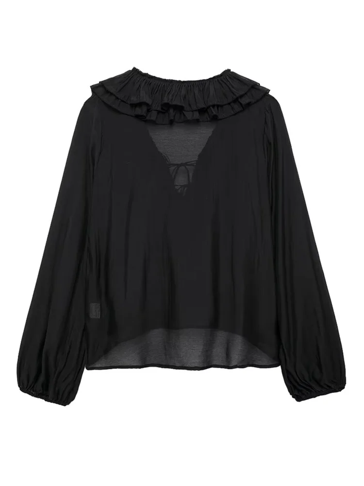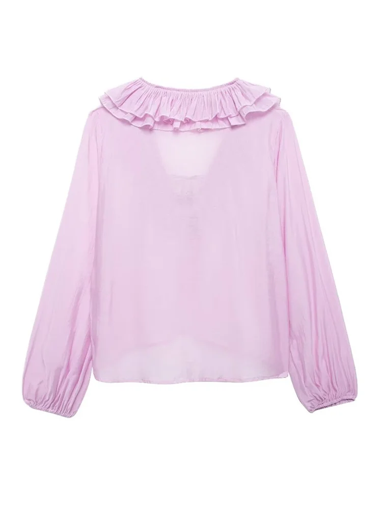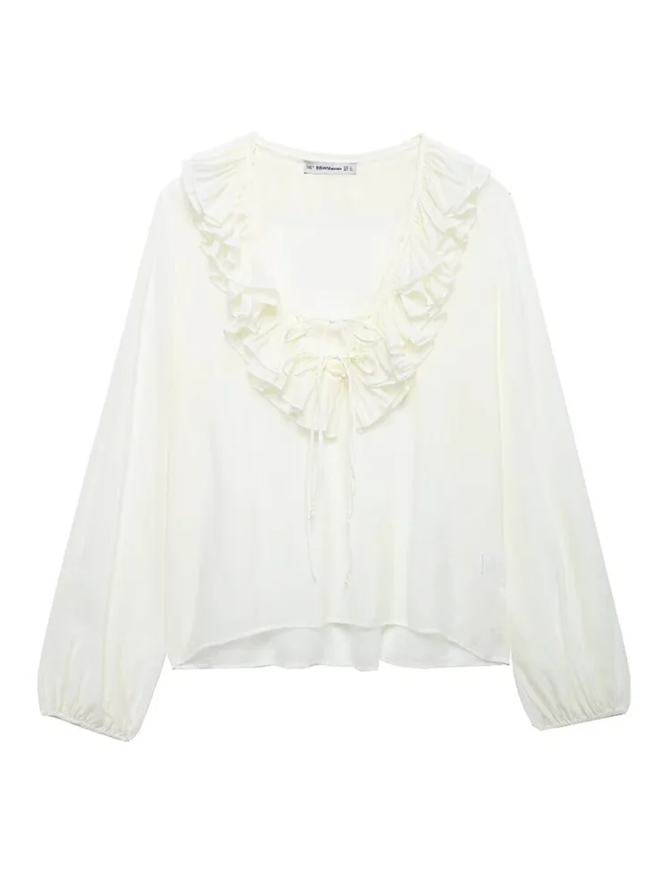 Featuring delicate ruffles, this blouse adds a feminine touch to any casual look.
