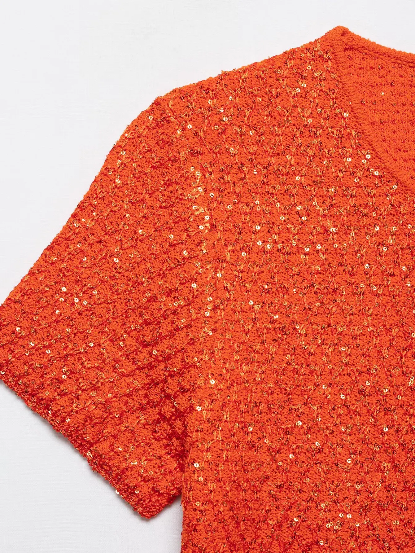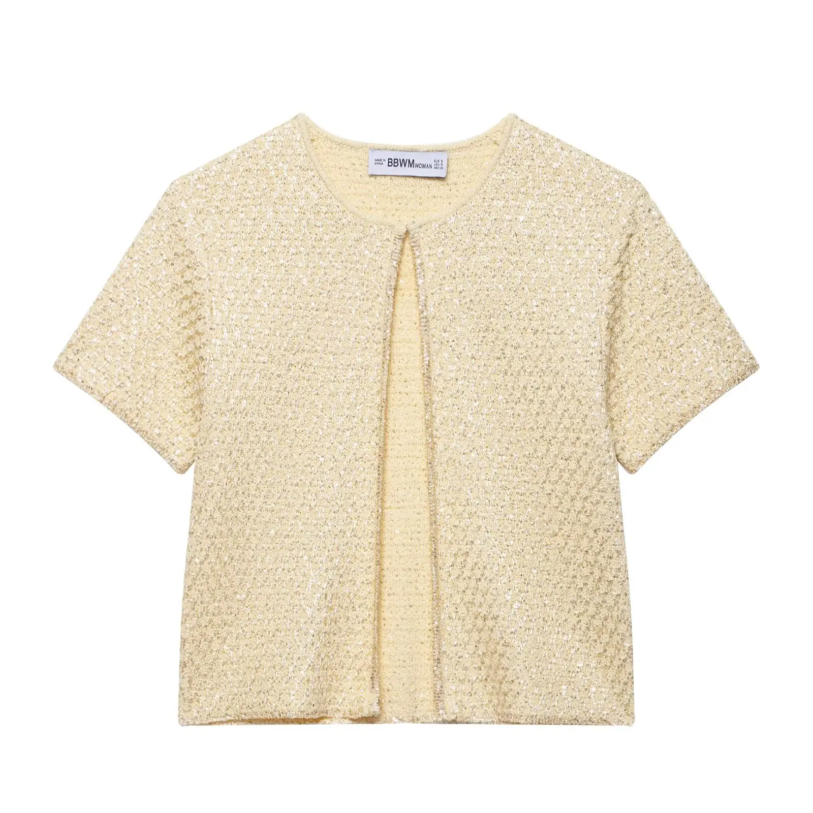 Zevity Women Fashion O Neck Short Sleeve Sequined Design Knitted Sweater Female Chic Open Stitching Crop Coats Chic Tops CT9378