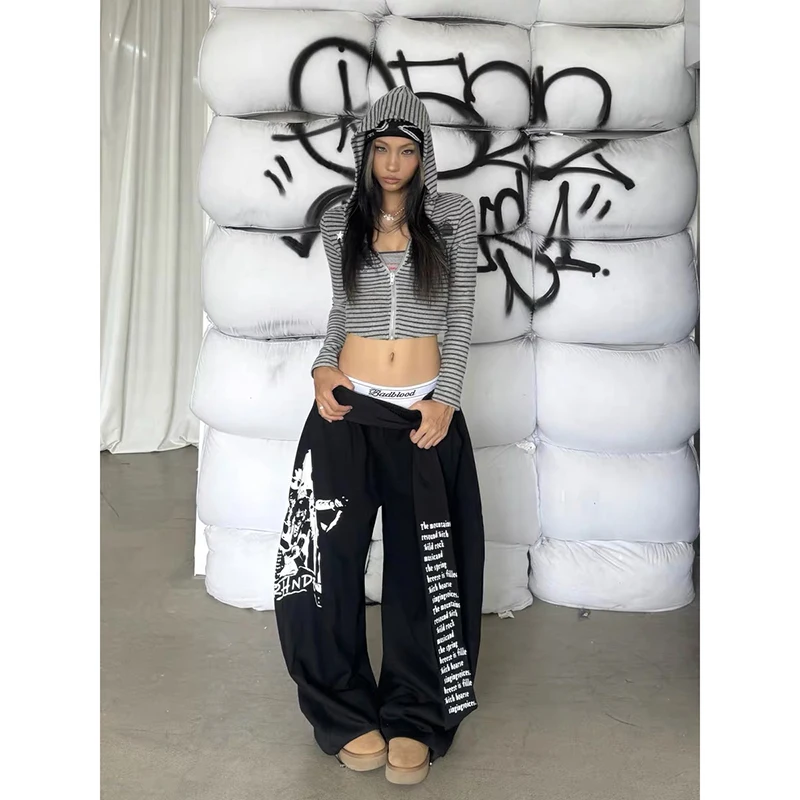 ZHIZOU Women Gray Gothic Baggy Y2k Letter Print Pants Harajuku 2000s Vintage Oversize Sweatpants Wide Leg Trousers Autumn 2025